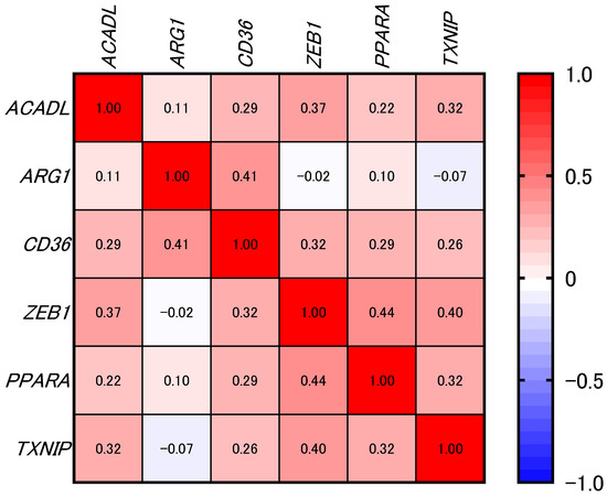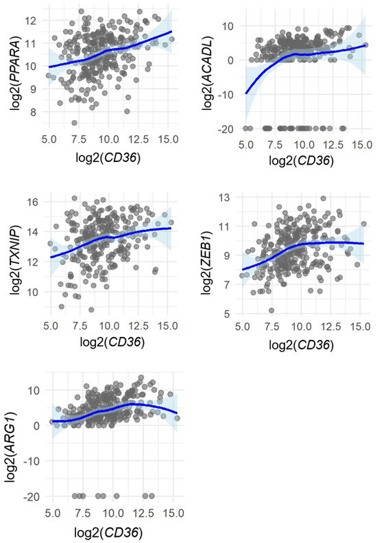 Spearman’s rank correlation analysis revealed modest but statistically significant positive associations between CD36 and several genes: ACADL (ρ = 0.29, p < 0.0001), ARG1 (ρ = 0.41, p < 0.0001), ZEB1 (ρ = 0.32, p < 0.0001), PPARA (ρ = 0.29, p < 0.0001), and TXNIP (ρ = 0.26, p < 0.0001) (Figure 4 and Figure 5).