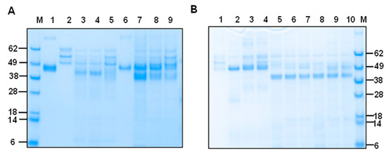 E-64 inhibition of the fibrinogenolytic action of mHcCPs. Proteins were analyzed by SDS-PAGE followed by Coomassie blue staining. mHcCPs were pre-incubated with two different concentrations of E-64 for 15 min at 37 °C prior to the addition of ovine fibrinogen (oFg), the mixtures were further incubated for 16 h at 37 °C at pH 7.4. (A). Lane M, protein standards; Lane 1, intact mHcCBP1; Lane 2, oFg; Lane 3, oFg and mHcCBP1; Lane 4, oFg and mHcCBP1 in the presence of 10 µM of E-64; Lane 5, oFg and mHcCBP1 in the presence of 50 µM of E-64; Lane 6, mHcCP1c alone; Lane 7, oFg and mHcCP1c; Lane 8 oFg and mHcCP1c in the presence of 10 µM of E-64; Lane 9, oFg and mHcCP1c in the presence of 50 µM of E-64. (B). Lane M, protein standards; Lane 1, oFg; Lane 2, oFg and mHcCBP2; Lane 3, oFg and mHcCBP2 in the presence of 10 µM of E-64; Lane 4, oFg and mHcCBP2 in the presence of 50 µM of E-64; Lane 5, oFg and mHcCP1a; Lane 6, oFg and mHcCP1a in the presence of 10 µM of E-64; Lane 7, oFg and mHcCP1a in the presence of 50 µM of E-64; Lane 8, oFg and mHcCP1b; Lane 9, oFg and mHcCP1b in the presence of 10 µM of E-64; Lane 10, oFg and mHcCP1b in the presence of 50 µM of E-64.
