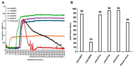 mHcCP treatments resulted in varying levels of clot density in human reference plasma; therefore, we used the half-time to describe the time required to reach half-maximum absorbance, which is equivalent to the maximum clot density (Figure 8B). Pre-incubation with each mHcCP had a similar half-time, except for mHcCBP2, which had a half-time of 3 min and 40 s, accounting for a shorter clot initiation and lower maximum clot density. After incubation, the clot density of the plasma pre-incubated with mHcCPs was lower than that of the plasma alone (Figure 8A). While the clot density of plasma pre-incubated with mHcCBP1, mHcCBP2, or mHcCP1c remained constant, mHcCP1a and mHcCP1b lysed the plasma clot by a lysis time of 19 min for mHcCP1a and 3 min for mHcCP1b, respectively (Figure 8A).