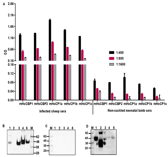 Detection of mHcCPs by ELISA (A) and Western blotting using pooled sera from sheep naturally infected with GI nematodes (B) or non-suckled neonatal lambs (C). Rabbit anti-HcCBP2 sera were used to detect mHcCBP2 in Western blotting (D). For Western blotting, Lane 1, mHcCBP1; Lane 2, mHcCBP2; Lane 3, mHcCP1a; Lane 4, mHcCP1b; Lane 5, mHcCP1c; Lane M, protein molecular standards.
