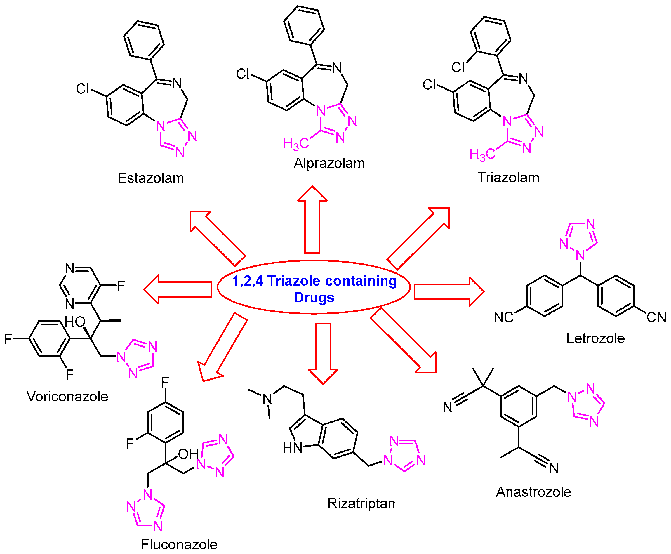 - Channabasappa, V.; Kumar, K.A.; Vagish, C.B.; Sudeep, P.; Jayadevappa, H.P.; Kumar, A. 1,2,4-triazoles: Synthetic and medicinal perspectives. Artic. Int. J. Curr. Res. 2020, 12, 12950–12960. [Google Scholar]