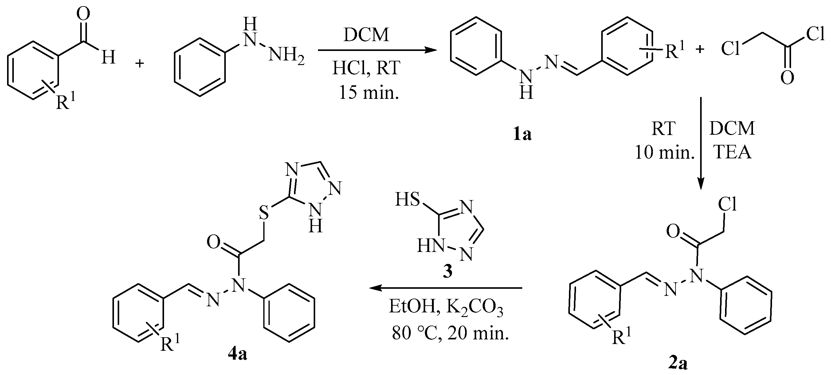 4.3. Procedure for Synthesis of E-2-((1H-1,2,4-Triazol-5-yl)thio)-N-benzylidene-N-phenylacetohydrazide