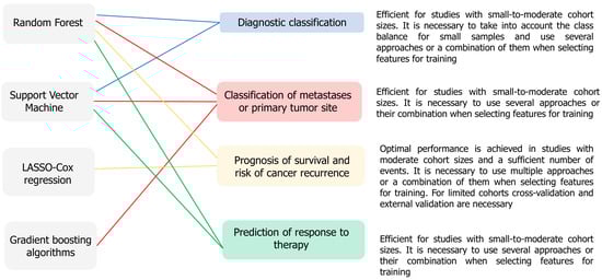 Associations of conventional ML algorithms with oncology research problems, according to the main trends in the analyzed studies. The diagram links frequently used algorithms to diagnostic classification, metastasis/primary site classification, prognosis of survival and recurrence risk, and prediction of response to therapy.