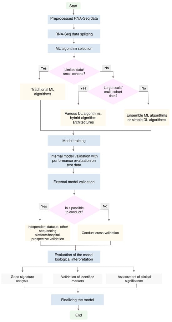 Machine learning (ML) is a field of artificial intelligence concerned with the identification of patterns in data and the improvement of algorithms based on acquired knowledge [10]. ML has emerged as a potent instrument for the automation of RNA-Seq data processing, enhancing the precision of detecting biologically significant gene expression patterns and optimizing the interpretation of results in biomedical research [11,12]. The application of ML in RNA-Seq data analysis has already significantly advanced the search for new informative diagnostic and prognostic markers and the development of personalized therapeutic strategies [13,14]. Nevertheless, despite the growing number of studies in this field, several challenges remain to be addressed. The challenges encountered primarily pertain to data preprocessing, the selection of optimal algorithms, and the interpretability of the results.