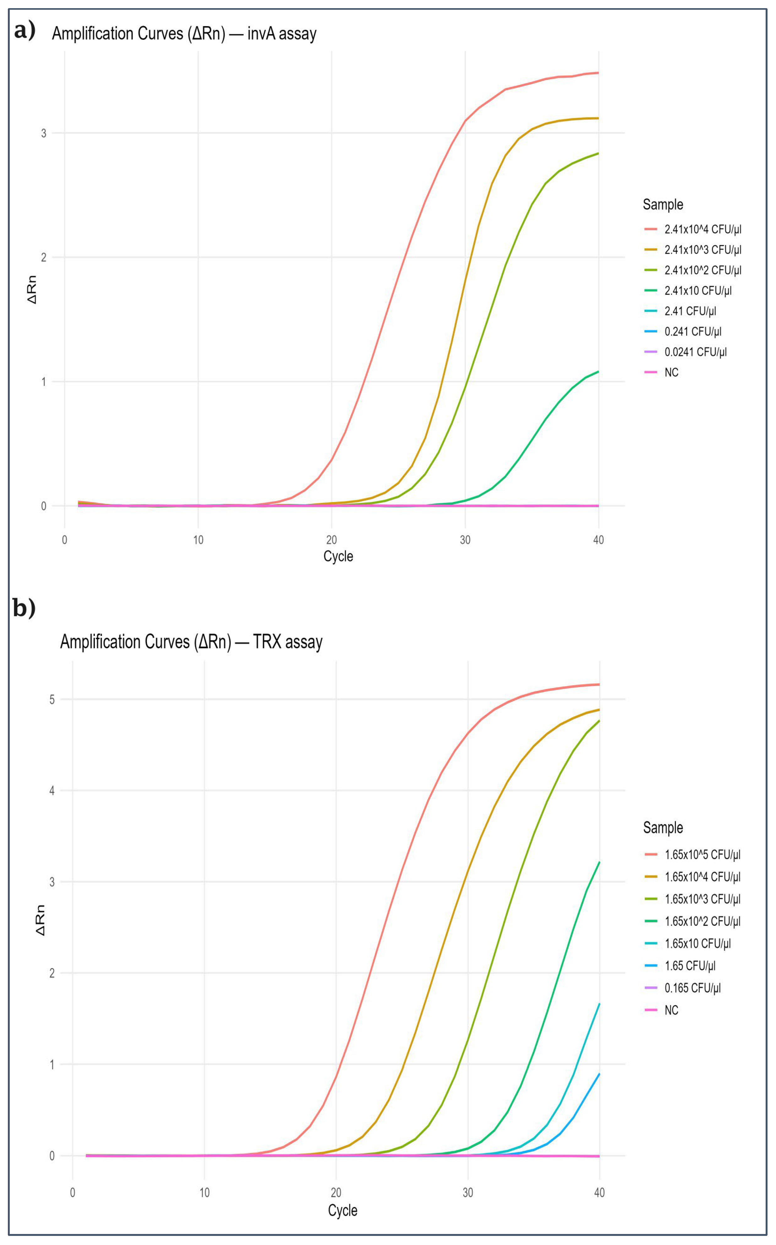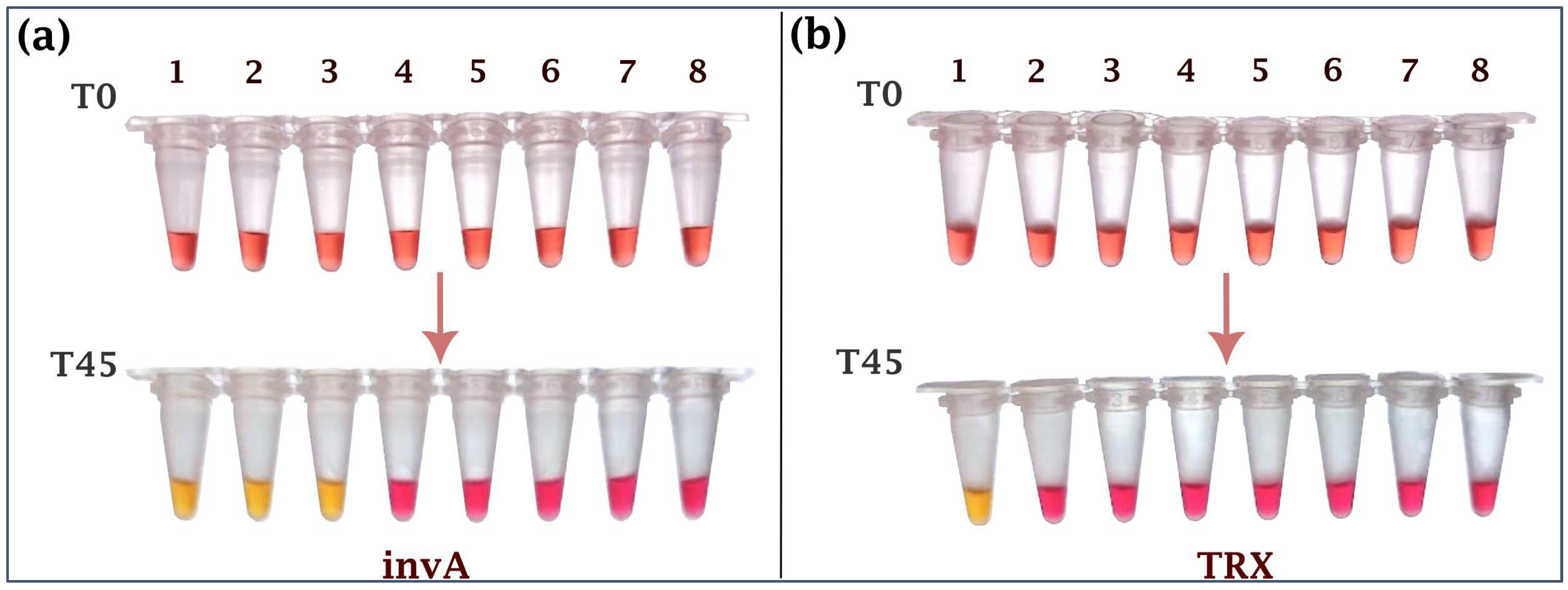 - Pavon, R.D.N.; Rivera, W.L. Loop-Mediated Isothermal Amplification Assay for Visual Detection of Salmonella enterica Serovar Typhimurium in Food Animal Meat Products. Foods 2025, 14, 1731. [Google Scholar] [CrossRef]