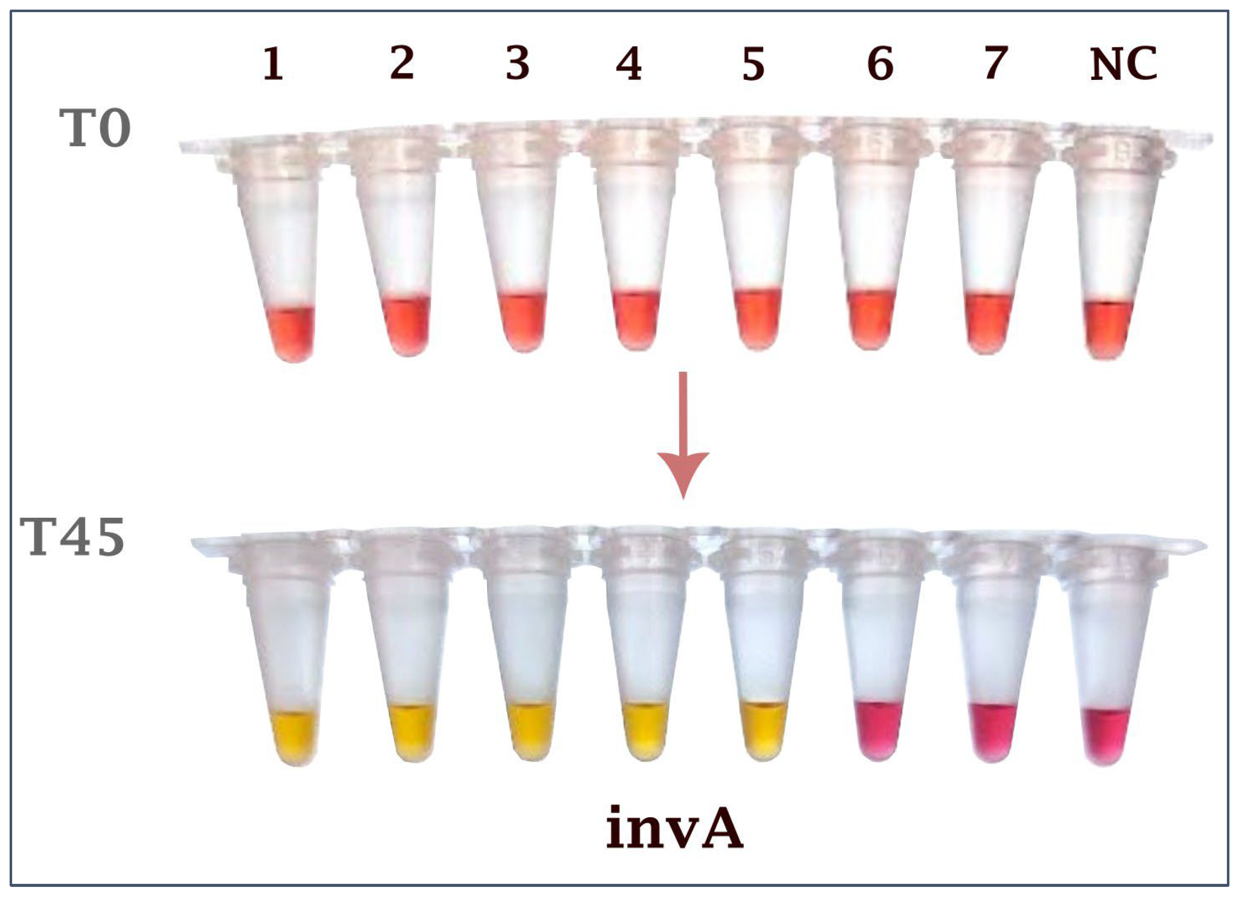- Skenndri, S.; Nassik, S.; Lakhmi, R.; Anneggah, B.E.; Lahkak, F.E.; Moumen, A.; Abdellaoui Maane, I. A Colorimetric LAMP Assay for Salmonella spp. Detection: Towards a DNA Extraction-Free Approach for Pathogen Screening. Foods 2025, 14, 521. [Google Scholar] [CrossRef]