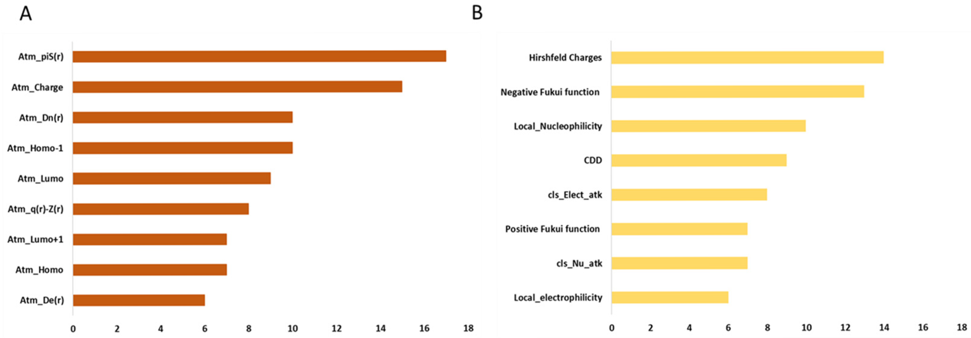 Figure 1 displays the most frequent stereo-electronic descriptors selected by feature selection and used to develop the predictive models. Among the eight most frequently involved PM7-derived stereo-electronic parameters, three are related to the stability of a given molecule (Parr & Pople absolute hardness, heat of formation, and dielectric energy), two are related to the molecular reactivity (piS total and De total), and one is related to polarity (electric dipole moment). The nucleophilicity and electrophilicity are described by the homo and lumo energies. Concerning the most frequent DFT-derived stereo-electronic parameters, four are related to the nucleophilicity and electrophilicity (nucleophilicity index, electrophilicity index, Fukui function, and Hirshfeld charges), while two regard the overall stability/reactivity of a given molecule (chemical potential and thermal energy), and one to polarity (electric dipole moment). The DFT-based models particularly benefit from the inclusion of Hirshfeld charges, as demonstrated in reactions such as redox of sulfur atoms, CHOH ↔ C=O → COOH, ester hydrolysis, methylations, and glutathione conjugations, as further detailed in