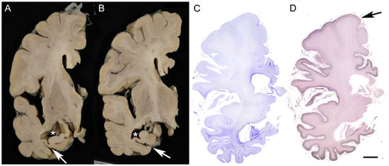 Macroscopic finding of AD brain. The panels show an AD case with a clinical duration of 8 years; the patient died at the age of 79. (A,B) The parahippocampal gyrus and hippocampus exhibit marked atrophy in association with dilatation of the lateral ventricle (*) and collateral sulcus (arrows). The atrophy is prominent in the posterior portion (B). (C,D) Pronounced astrogliosis is observed on Holzer staining (C), and strong argyrophilicity is evident on Gallyas silver impregnation (D) in the medial temporal areas and limbic cortices, showing decreasing gradient toward the frontal cortices with relative preservation of the precentral gyrus (arrow). Scale bar = 1 cm.