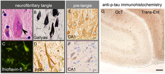 Tau aggregation in AD. (A–D) Neurofibrillary tangles (A, arrowhead) are argyrophilic and thioflavin-positive cytoplasmic inclusions, mainly composed of hyperphosphorylated tau (p-tau). (E) Pretangles are diffuse cytoplasmic tau aggregates, often showing strong immunoreactivity along the nuclear membrane. (F) Anti-tau-oligomer-specific immunohistochemistry recognizes pretangles. (G) In AD, dense tau aggregation in the neuronal cytoplasm and neurites results in a layer-specific pattern of immunostaining in the transentorhinal (Trans-Ent) cortex, one of the earliest sites of cerebral lesions, and to a lesser extent in the occipitotemporal (OCT) cortex. Scale bars: (A–F) 10 μm and (G) 100 μm. (D,E,G) Anti-p-tau (clone AT8, mouse monoclonal, 1:3000, Waltham, MA, USA) and (F) anti-tau oligomer (clone 2D6-2C6, rat monoclonal, 1:100 [20]) antibodies.