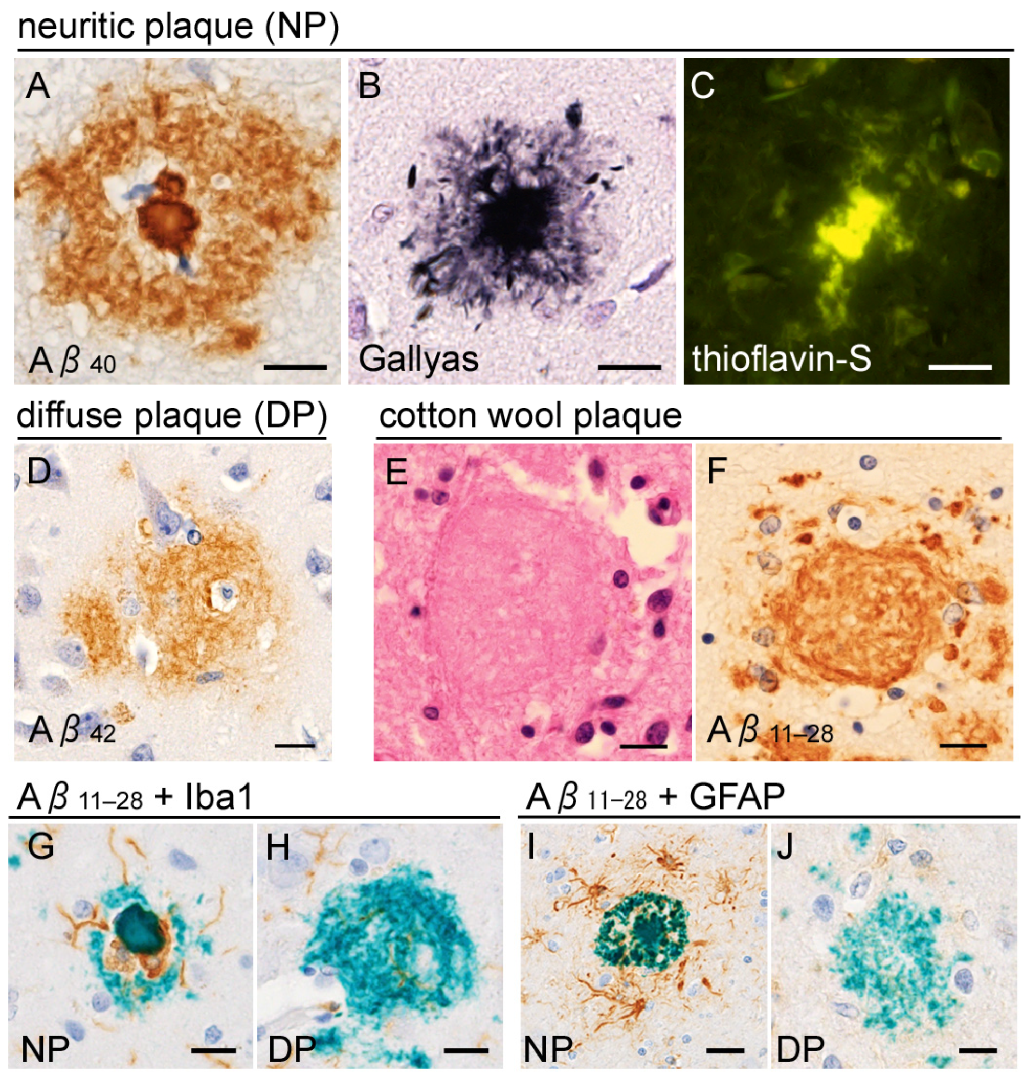 Senile plaques. (A–D) Neuritic plaques (NPs) are Aβ deposits within the neuropil, characterized by a dense core and peripheral halo (A). Anti-Aβ40 immunohistochemistry clearly labels the plaque core (A). The core is surrounded by strongly argyrophilic (B) and thioflavin-S-positive (C) crowns, composed of dystrophic neurites. (D) Diffuse plaques (DPs) are Aβ42-rich and lack the distinct core and crown structures. (E,F) Cotton wool plaques observed in a PSEN1-mutated case are shown (mutated site is not available in this case). They lack a core and crown but display a well-defined boundary, different from diffuse plaques. (G,H) Anti-Iba1 immunohistochemistry reveals microglial infiltration within the space between the core and halo (G), which is not observed in diffuse plaque (H). (I,J) Anti-glial fibrillary acidic protein (GFAP) immunohistochemistry shows that astroglia are prominent around the neuritic plaques, rather than inside. Scale bars (A–J) 10 μm. (A) Anti-Aβ40 (rabbit polyclonal, 1:500, IBL, Gunma, Japan), (D) anti-Aβ42 (rabbit polyclonal, 1:500, IBL), and (F–J) anti-Aβ11–28 (clone 12B2, mouse monoclonal, 1:1000, IBL) antibodies.