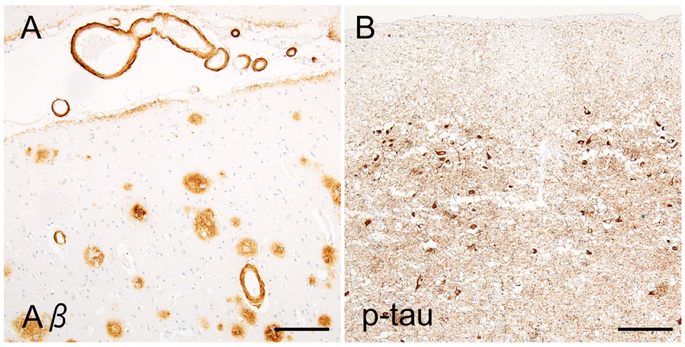 AD pathology in a Down syndrome case. The patient had Down syndrome (21 trisomy) and died at the age of 48. Down syndrome cases demonstrate not only senile plaques and cerebral amyloid angiopathy ((A), temporal neocortex, Aβ11–28) but also severe tau aggregates ((B), entorhinal cortex, AT8). Scale bars = 100 μm.