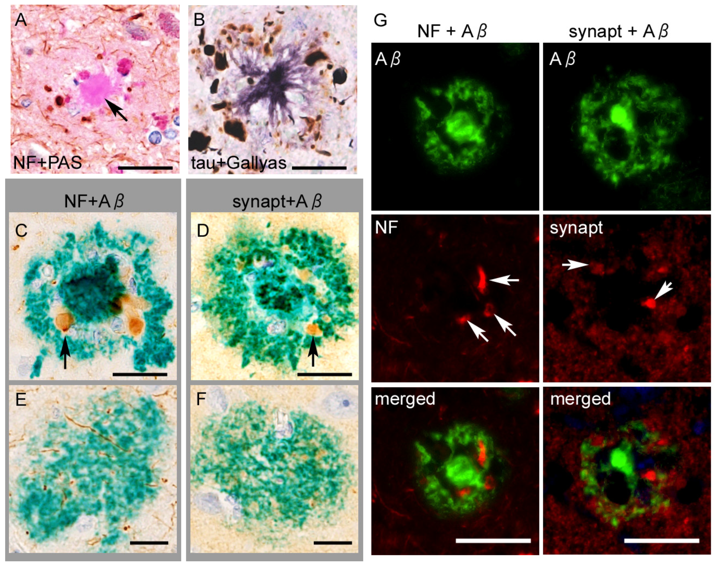 Neuroaxonal or tau epitopes on senile plaques. (A) Anti-neurofilament (NF) immunohistochemistry combined with PAS-staining shows swollen axons surrounding the plaque core. The core itself (arrow) is immunonegative. (B) Anti-p-tau (AT8) immunohistochemistry combined with silver impregnation reveals neuritic tau aggregates surrounding an amyloid core. (C–F) Neuritic plaques contain epitopes of NF and synaptophysin (synapt) ((C,D), arrows) around the plaque core, whereas diffuse plaques do not (E,F). (G) Double immunofluorescence shows dystrophic axons (arrows in the left column) or swollen terminals (arrows in the right column) are engulfed by Aβ11–28, without a clear co-localization. Scale bars = (A–F) 10 μm and (G) 20 μm.