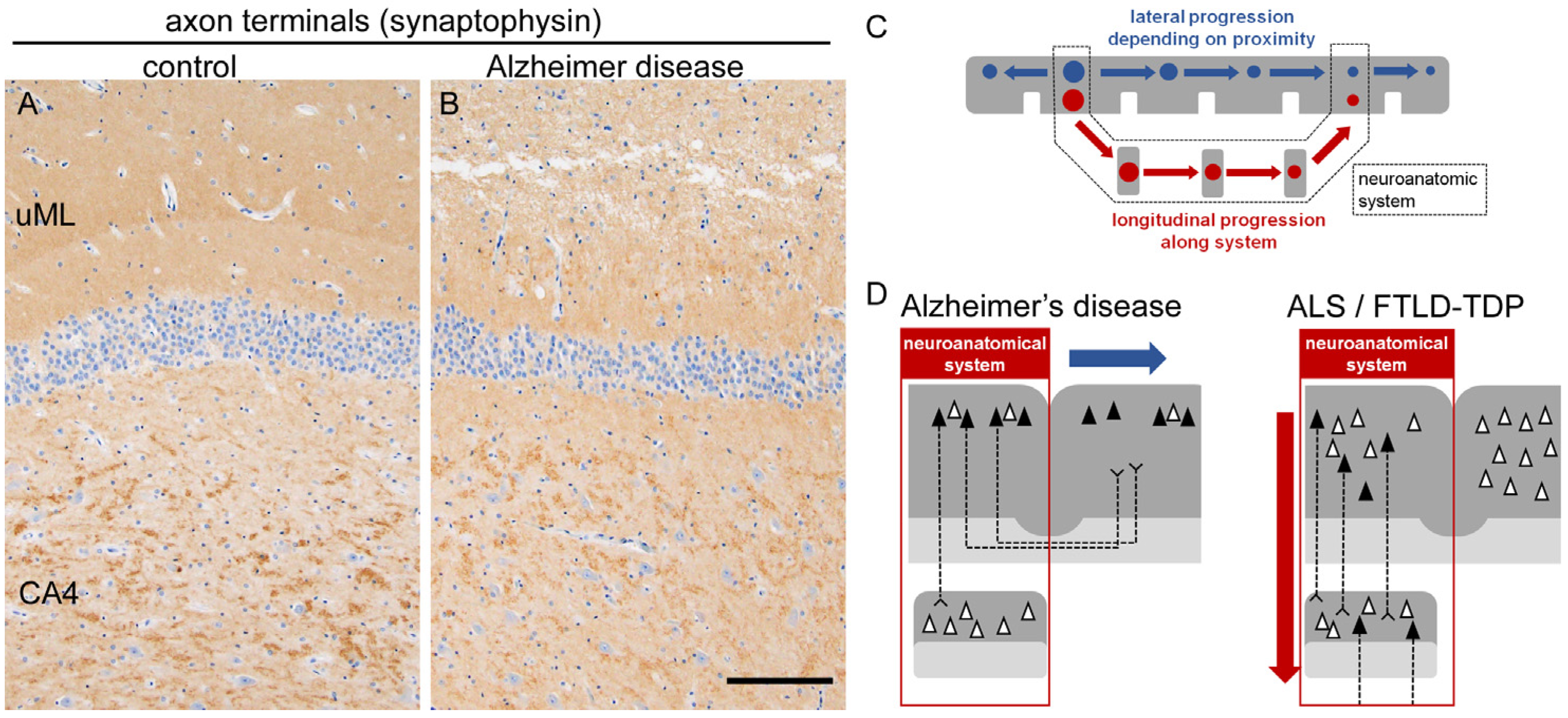 Synaptic loss and schematic of system degeneration. (A,B) In AD, axon terminals are depleted in the upper molecular layer (uML) of the hippocampal dentate gyrus, indicating loss of projection from the parahippocampal gyrus. Note the preservation of large synaptic boutons in CA4 projected from the dentate gyrus. Anti-synaptophysin immunohistochemistry. Scale bar = 100 μm. (C) Schematic illustration of lateral (blue) and longitudinal (red) modes of system degeneration. Lateral degeneration depends on spatial proximity and occurs in a mono-nodal manner when the system is considered. Longitudinal degeneration is poly-nodal and continuous along the system. Gray matter is depicted in gray, and circles indicate neuronal loss and protein aggregation at each node. (D) Simplified illustration of lateral spreading of AD-related tau pathology and longitudinal spreading of ALS/FTLD-related changes. Gray matter is shown as dense gray, white matter as light gray, and red frames indicate the neuroanatomical system. The filled triangles indicate neurons containing protein aggregates, whereas blank ones are not affected.