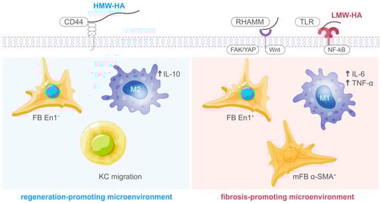 Figure 1. Molecular weight-dependent mechanisms of hyaluronic acid in cellular repair. HMW-HA (left) and LMW-HA (right) engage distinct receptors and polarize macrophages toward regenerative (M2, IL-10) or inflammatory (M1, IL-6/TNF-α) phenotypes, respectively. FB En1 = engrailed-1 positive fibroblasts; KC = keratinocytes; mFB α-SMA+ = myofibroblasts. The molecular weight-dependent effects of hyaluronic acid on cell migration and motility have been demonstrated across various cell types and tissue contexts. Low-molecular-weight HA has been shown to promote endothelial cell spreading and migration through enhanced focal adhesion assembly [16], while LMW-HA has also been reported to facilitate cell transmigration across lymphatic endothelium by disrupting intercellular barrier function [17]. These findings across different cell types suggest that the pro-migratory effects of LMW-HA may represent a conserved biological response. In vitro scratch wound assays have demonstrated molecular weight-dependent effects of hyaluronic acid on keratinocyte repair mechanisms. Kawano et al. showed that high-molecular-weight HA (2290 kDa) at 0.1% concentration significantly promoted keratinocyte wound closure compared to medium- (987 kDa) and low-molecular-weight (8 kDa) fractions, with migration-promoting effects observable within 6 h and enhanced gap closure at 24 and 48 h [6]. Similarly, low-molecular-weight HA (~18 kDa) has been shown to significantly enhance keratinocyte migration in scratch assays through activation of HIF-1α/VEGF signaling pathways [18]. However, comparative studies evaluating commercially available formulations combining different molecular weight ranges with bioprotective agents such as trehalose remain limited, particularly regarding their distinct kinetic profiles and morphological patterns in cellular repair models. ↑ indicates upregulation. Blue and red shading distinguish regeneration-promoting (HMW-HA) and fibrosis-promoting (LMW-HA) microenvironments, respectively.