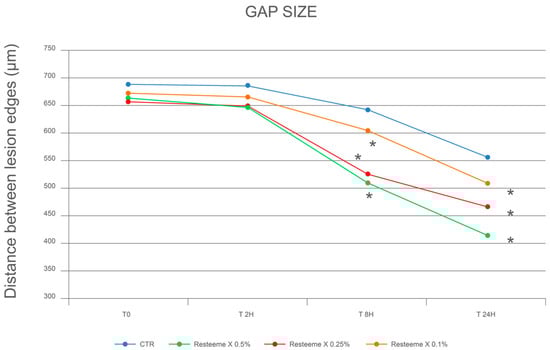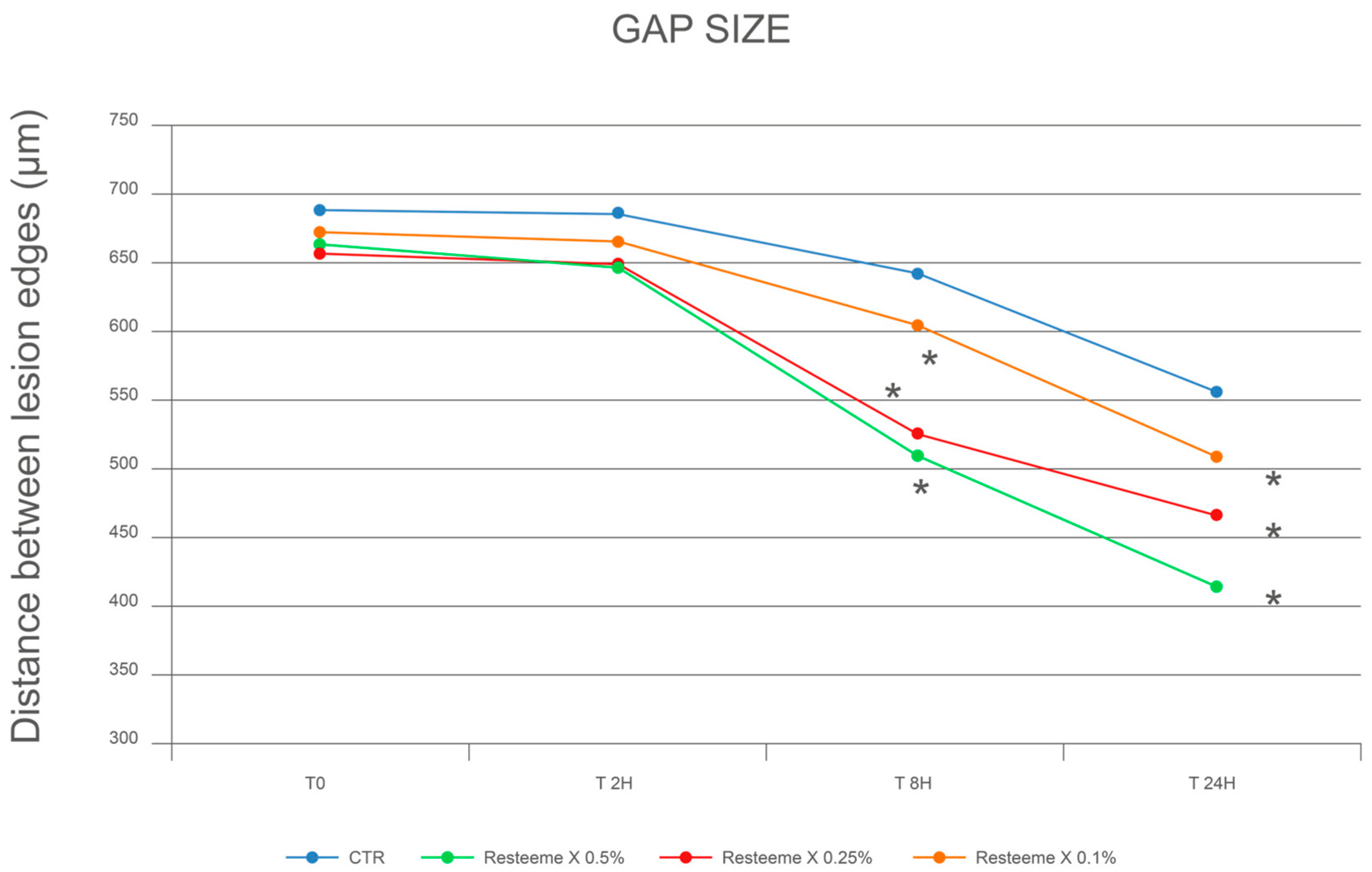 Figure 3. Quantitative analysis of inter-edge distance reduction in keratinocyte monolayers treated with Resteem X compared to untreated controls (CTR−) after 2, 8, and 24 h (mean ± SD). (*) indicate statistically significant differences compared to untreated control (p < 0.05). Standard deviations for all data points are provided in Table 1 and Table 2.