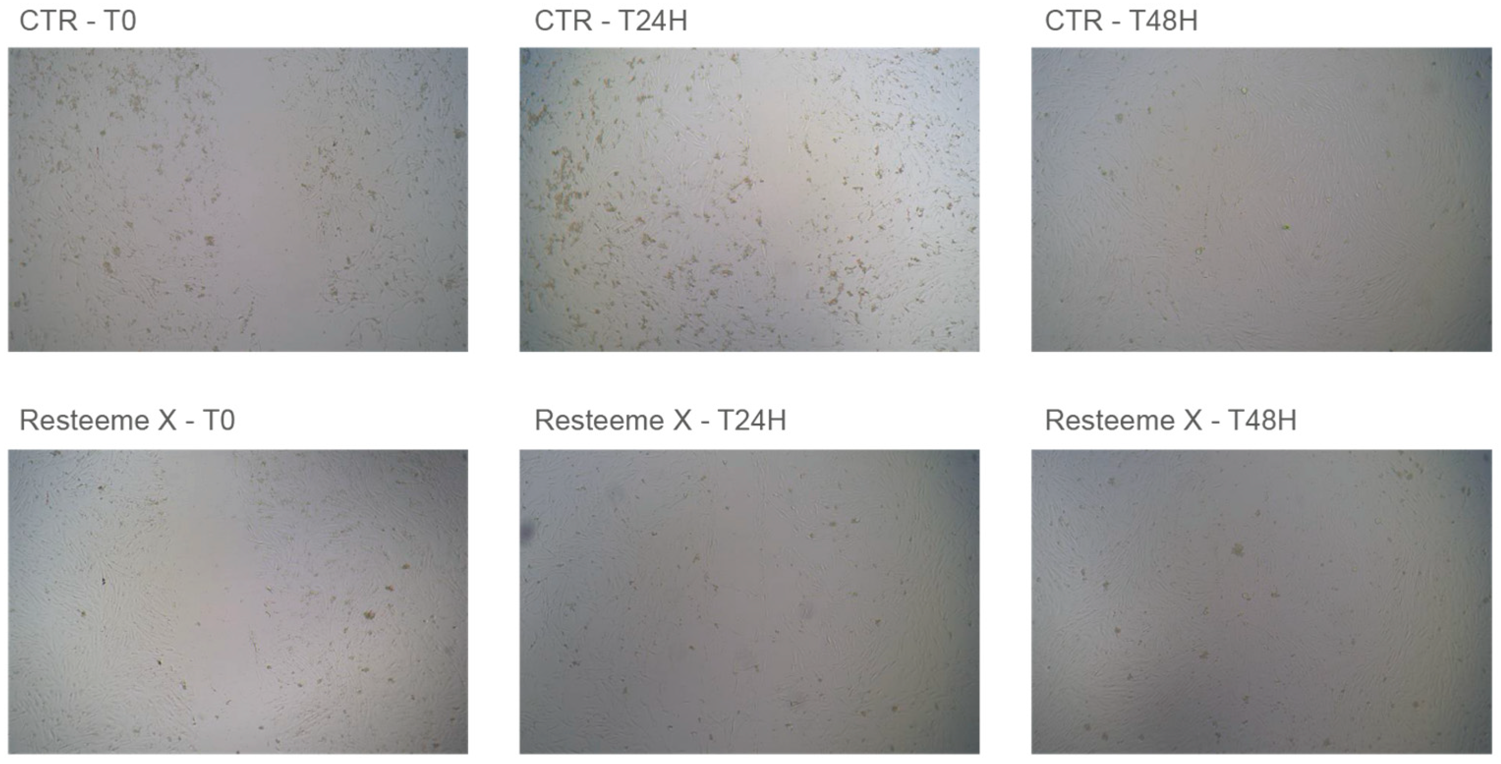 Table 1. Mean inter-edge distances (µm ± SD) and percentage change (Δ vs. T0) in control (CTR−) and Resteem X-treated cultures (0.5%, 0.25%, 0.1%). Values are presented as mean ± standard deviation derived from three separate experiments (n = 3).
