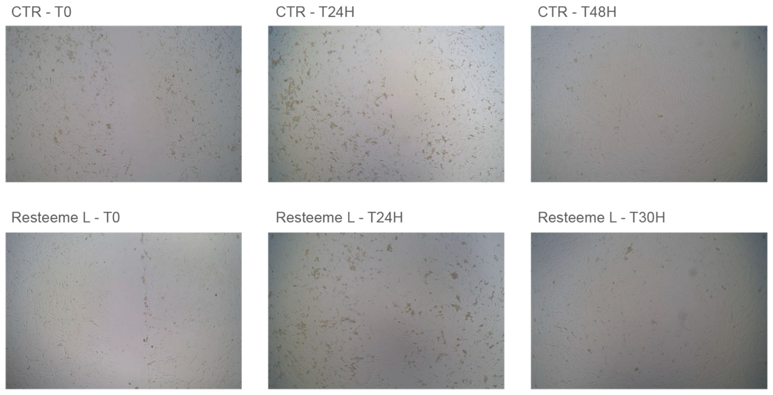 Table 3. Mean inter-edge distances (µm ± SD) and percentage change (Δ vs. T0) in control (CTR−) and Resteem L-treated cultures (0.25%, 0.1%, 0.05%). Values are presented as mean ± standard deviation derived from three separate experiments (n = 3).