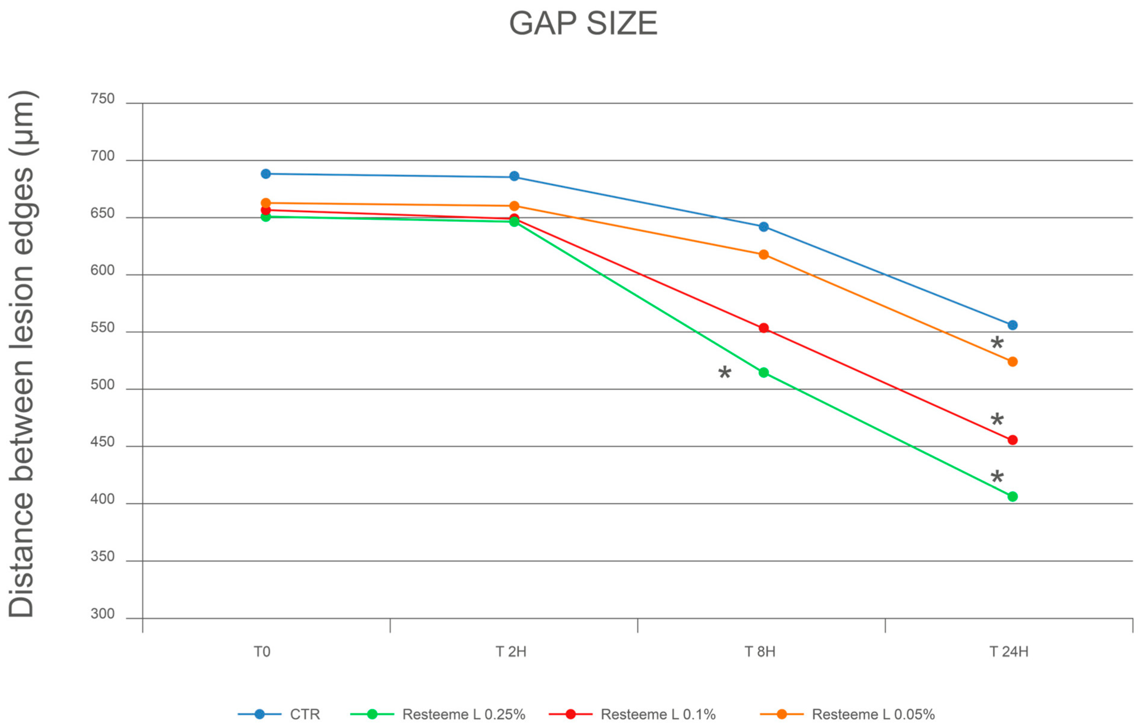 Figure 5. Quantitative analysis of inter-edge distance reduction in keratinocyte monolayers treated with Resteem L compared to untreated controls (CTR−) after 2, 8, and 24 h (mean ± SD). (*) indicate statistically significant differences compared to untreated control (p < 0.05). Standard deviations for all data points are provided in Table 3 and Table 4.