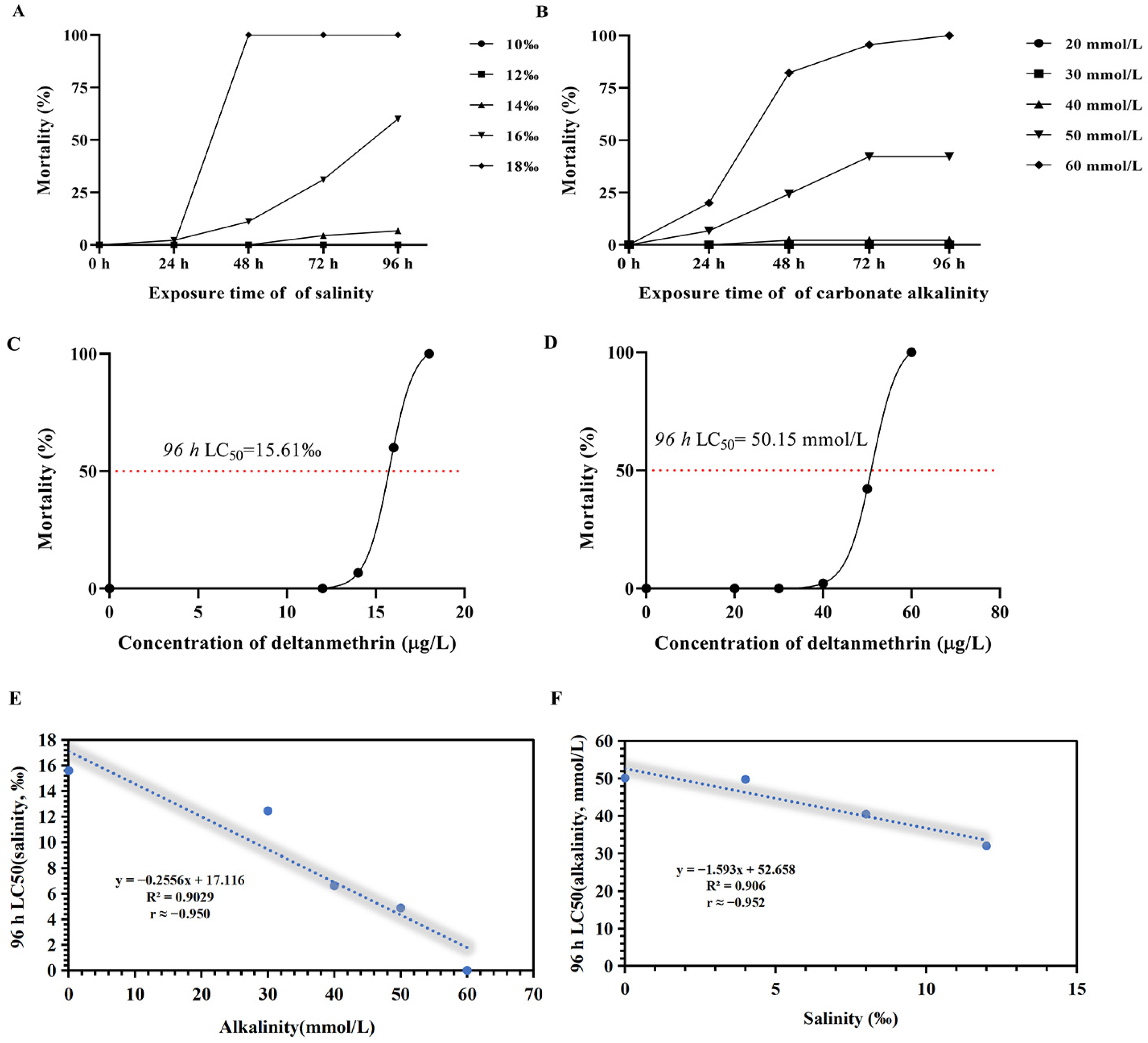 2.1. Median Lethal Concentration (96 h LC50) for Salinity and Alkalinity