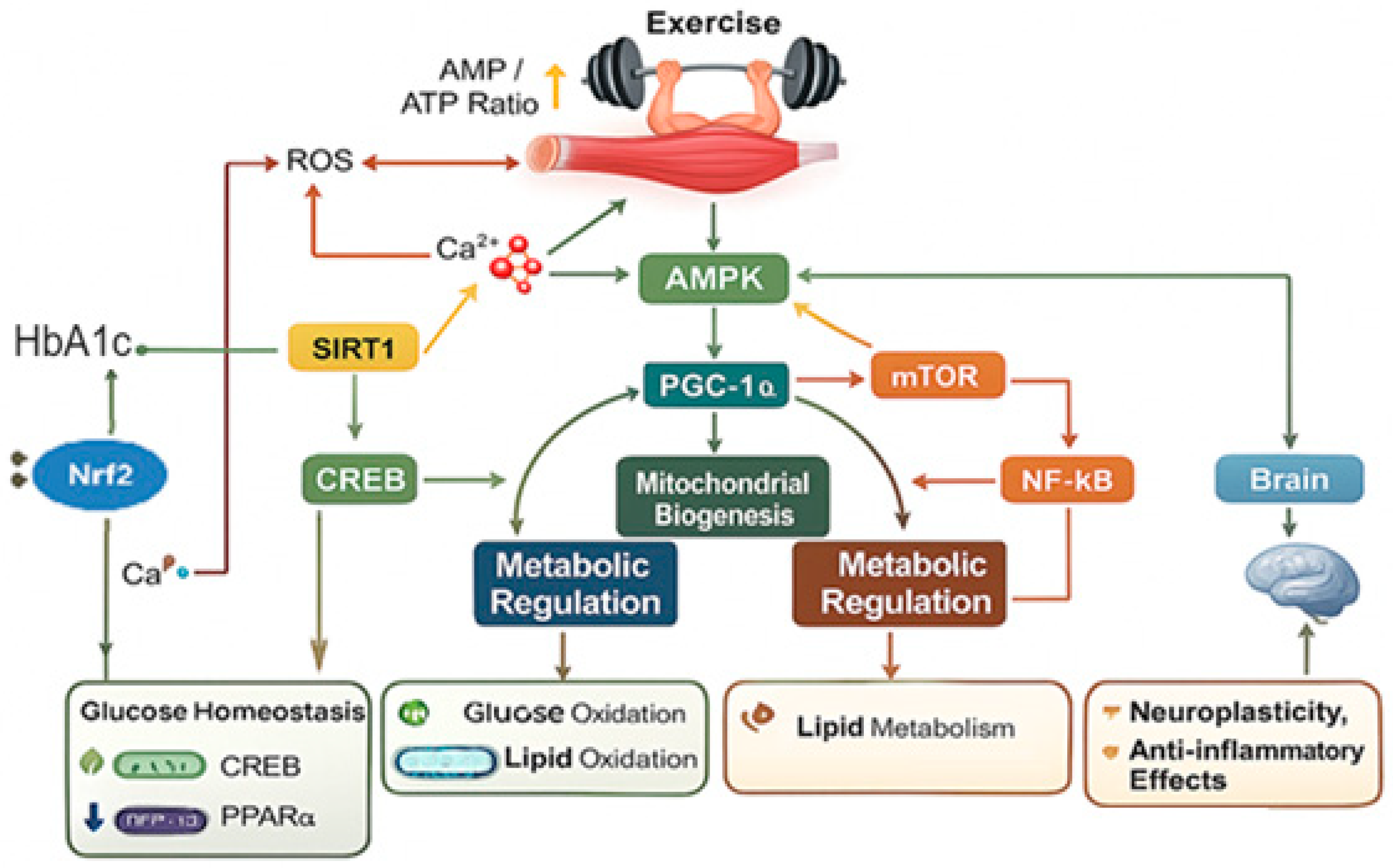| [61,96,97,98] | PGC-1α | AMPK, SIRT1, p38 MAPK Activation and endurance exercise | NRF1/2, ERRα, TFAM, VEGF | Mitochondria, oxidation and angiogenesis |