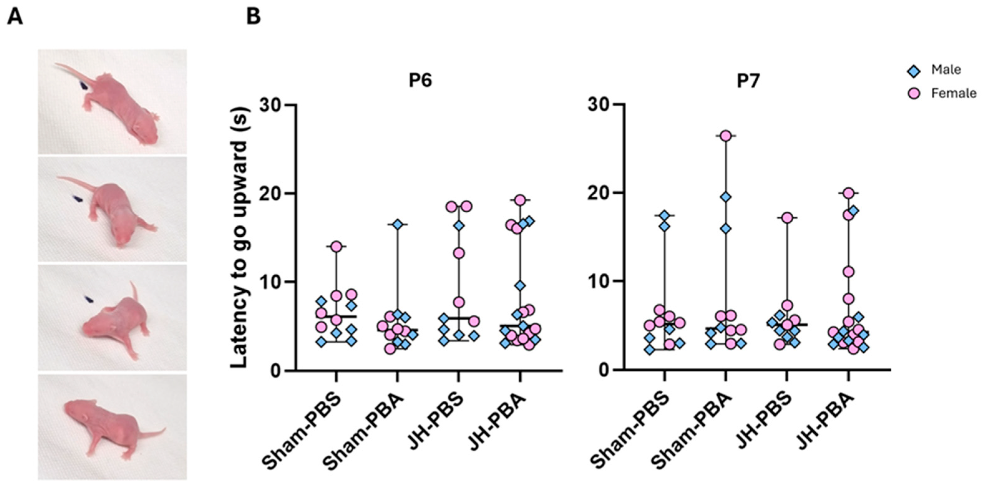 4.5.3. Negative Geotaxis Test (P6 and P7; Figure 6)