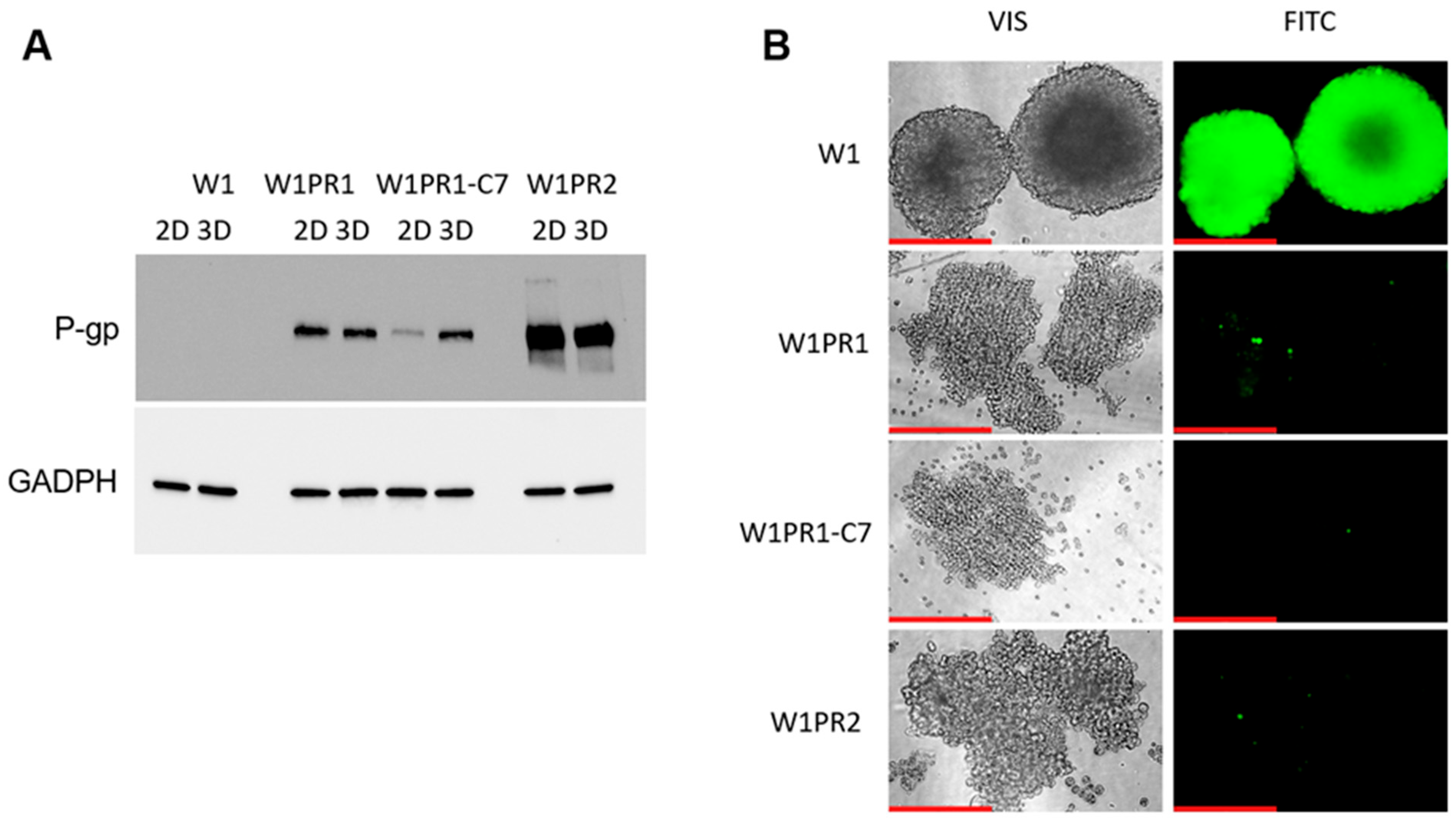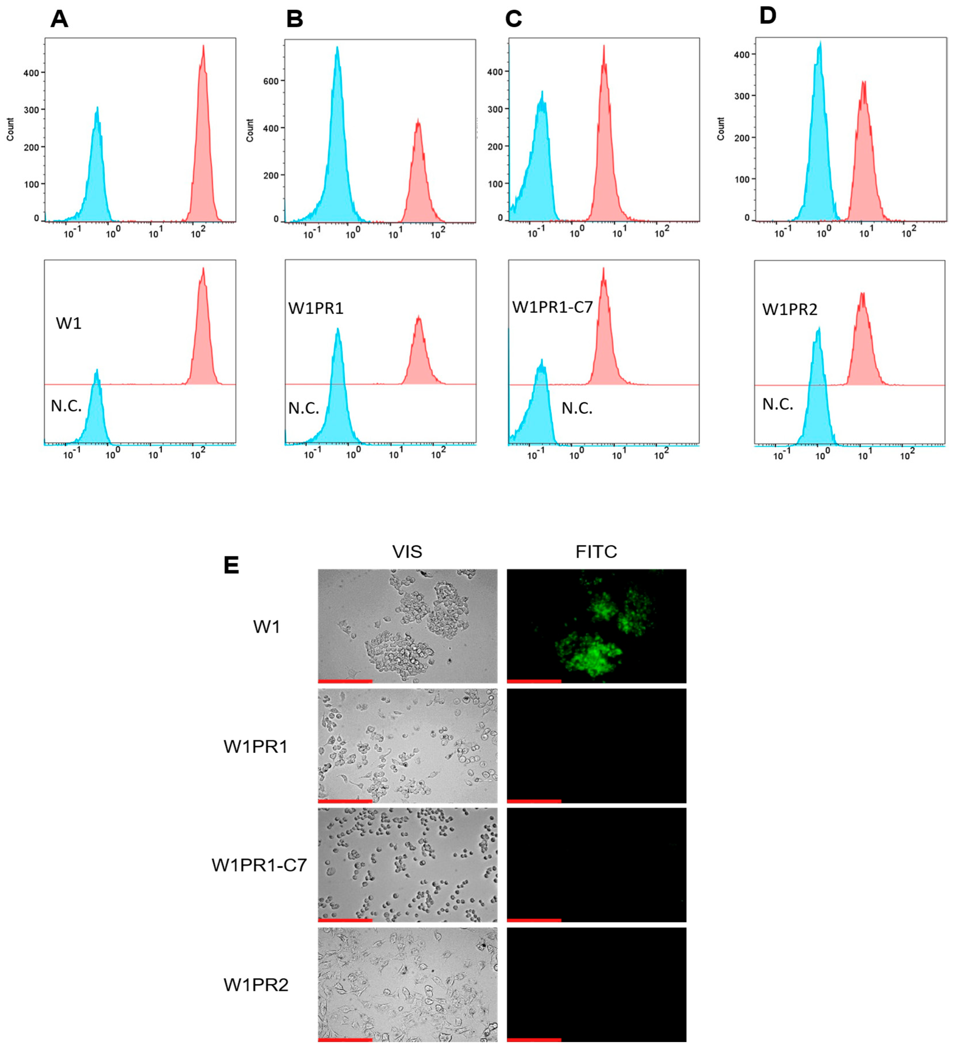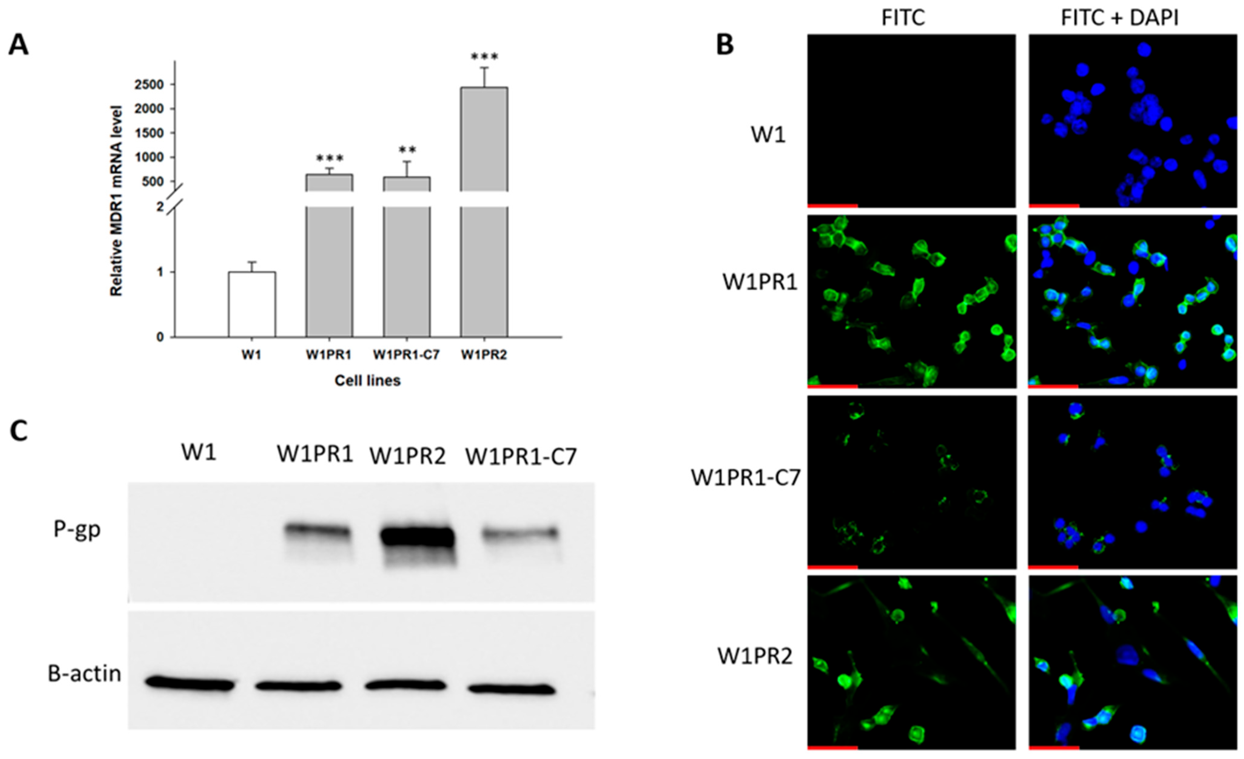 2.1. Characterization of MDR1 Gene and P-gp Protein Expression in W1 Cell Line and PAC-Resistant Cell Lines