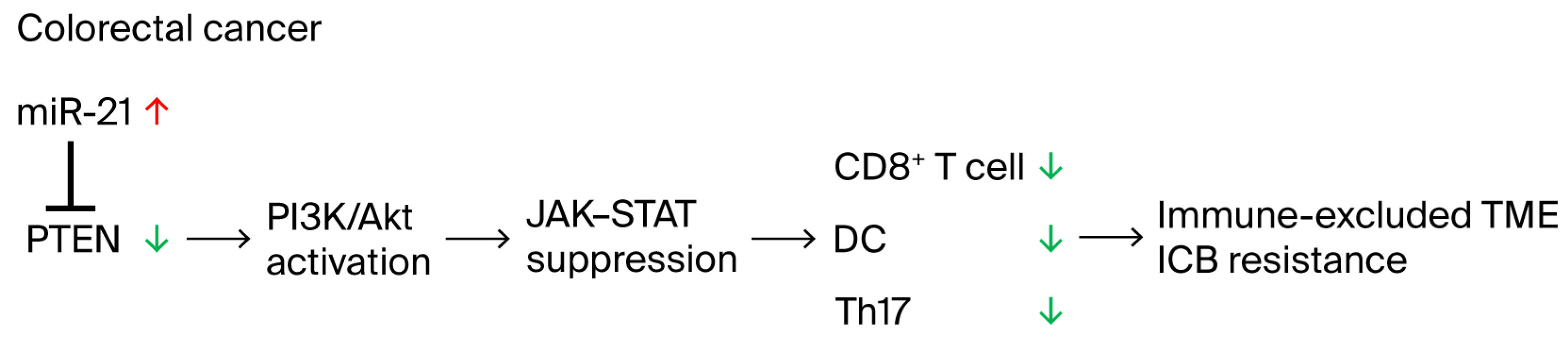 3.1. Tumor-Intrinsic Immune Suppression Mediated by miR-21-5p in Colorectal Cancer