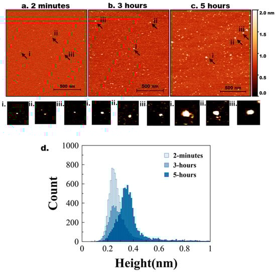 Next, tau and Aβ42 proteins at 10 nM were mixed, and the experiment was repeated as described above for the individual proteins. AFM images are shown in Figure 3. Initially (2 min, Figure 2a), only a few particles of round shape were seen. A few zoomed-in images, indicated with arrows labelled i, ii, and iii, are shown below in Figure 3a. As incubation time increased to 3 h (Figure 3b), the number of tau-Aβ42 aggregates on the surface increased. Similarly, zoomed images of a few particles (i, ii, and iii) are shown below Figure 3b. These particles are visually larger than those in Figure 1b. The aggregation is more pronounced after 5 h of incubation (Figure 3c), as shown in a few zoomed-in images. Overall, these data demonstrate that the coaggregation of tau-Aβ42 is more pronounced than the aggregation of either tau or Aβ42 individually.