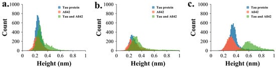 Figure 4a–c provide a comparative aggregation profile by overlapping the height distributions of tau, Aβ42, and co-aggregated tau & Aβ42 at 2 min, 3 h, and 5 h. Blue, orange, and green traces represent tau, Aβ42, and tau & Aβ42, respectively. These overlays show that Aβ42 enhances tau aggregation, as the combined tau & Aβ42 samples consistently show higher heights, most notably at 5 h. The data assembled at this incubation time demonstrate that there is no overlap between the height distributions of aggregates assembled with the tau-Aβ42 mixture (green histogram) and those of the protein aggregated separately (orange and blue histograms). This finding suggests that the primary co-aggregation of these two proteins occurs more frequently than their independent aggregation.