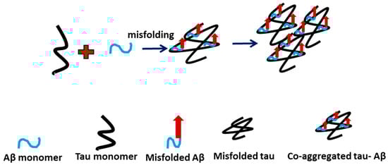 Graphical model of tau-Aβ42 interaction pathway. Co-aggregation of misfolded tau-Aβ occurs when mixed. Black indicates tau monomer, blue indicates Aβ monomer, and the blue with red arrow indicates misfolded Aβ.