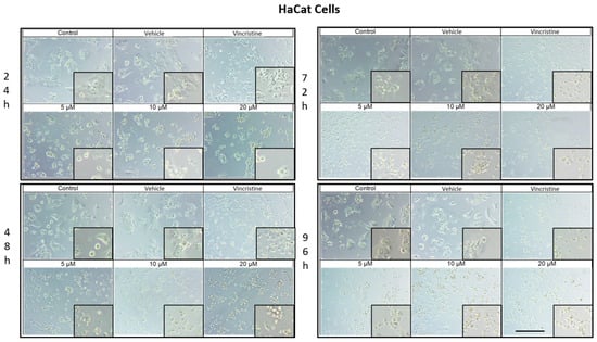 In HaCaT cells treated for 24 h (Figure 1), a reduction in cell confluence was observed at 5 μM, accompanied by morphological alterations such as cell rounding, shrinkage, and loss of adhesion. These effects intensified with higher CBD concentrations (10 and 20 μM), leading to decreased cell confluence and morphological features indicative of stress and cell death. Nevertheless, some cells retained their typical morphology. In comparison, cells treated with vincristine exhibited pronounced changes, including cell rounding, shrinkage, and widespread loss of adhesion.
