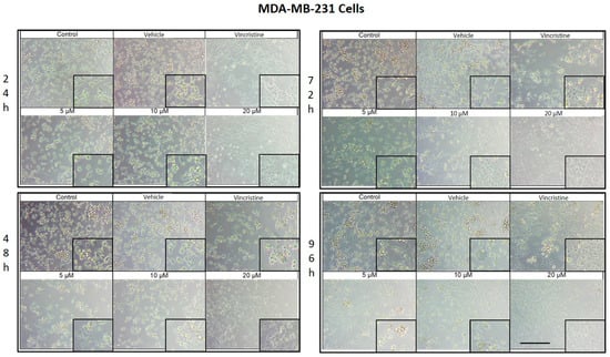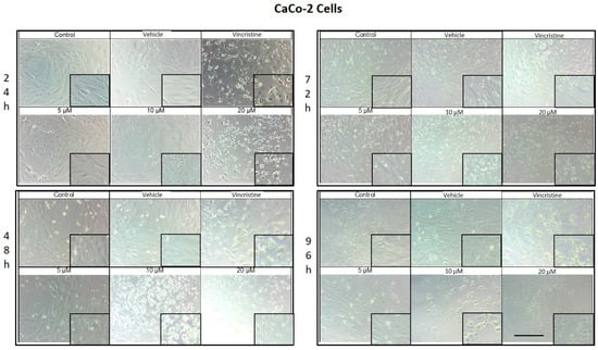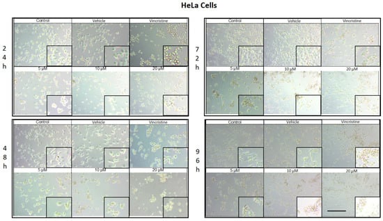Finally, after 96 h of treatment, the 5 and 10 μM concentrations showed a decrease in cell confluence, with evidence of stress and cell death, although cells with typical morphology were still observed in a smaller proportion. The 20 μM concentrations and vincristine presented effects similar to those observed at 72 h, with an almost total loss of cell adherence and morphology.