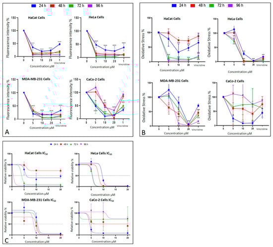 Cell behavior under different CBD concentrations evaluated using the MTT assay. (A) Cell viability and (B) oxidative stress in HaCaT, HeLa, MDA-MB-231, and CaCo-2 cell lines after 24 h (blue), 48 h (red), 72 h (green), and 96 h (purple) of treatment. Graphs represent the percentage of viable cells and oxidative stress as a function of CBD concentrations. (C) Dose–response curves for all evaluated cell lines (HaCaT, HUVEC, HeLa, MDA-MB-231, and CaCo-2), where cell viability (y-axis) is plotted as a function of increasing CBD concentrations (0 to 20 µM; x-axis). LC50 values were determined from these curves for each cell line and exposure time. Results are expressed as mean ± SEM (n = 3 independent biological replicates, each performed in triplicate). Statistical analyses were conducted using one-way ANOVA followed by Tukey’s post hoc test against vehicle-treated controls. * p < 0.05, ** p < 0.01, *** p < 0.001, **** p < 0.0001.