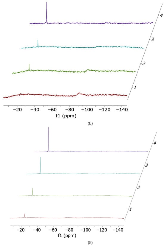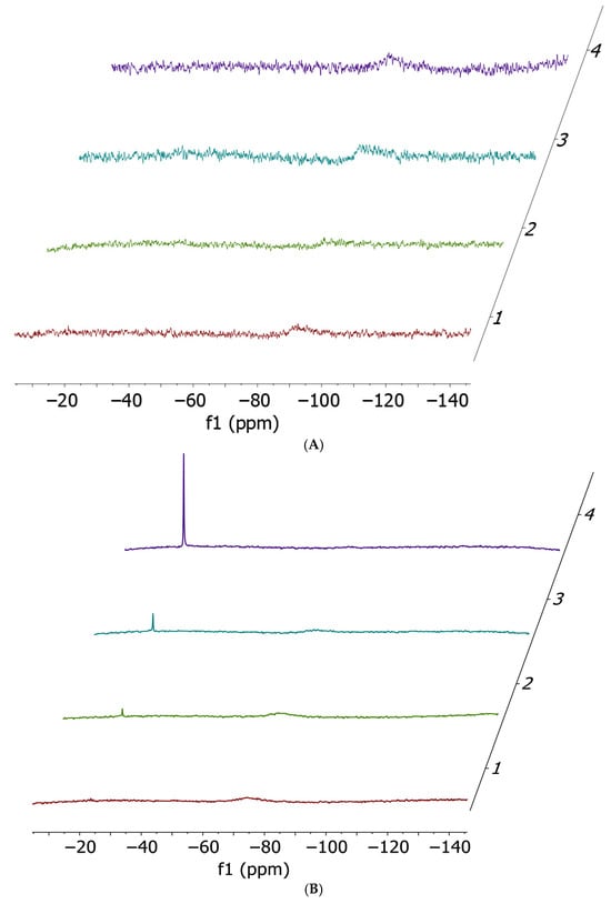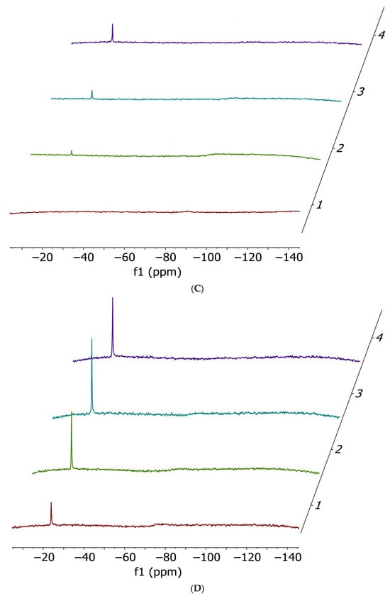 As shown in Figures S1–S4, it is evident that the two complexes upon dissolution in the reference medium are stable over time and that no ammonia release occurs. The stability of the 14N NMR signal also suggests that no halide release occurs under the applied experimental conditions. This observation contrasts with our previous findings on halide release from the two Pt compounds under physiological-like conditions [25]. However, in our case, the different behavior is attributable to the relatively high percentage of DMF, which disfavors halide displacement, and to the relatively large concentration of the two complexes.