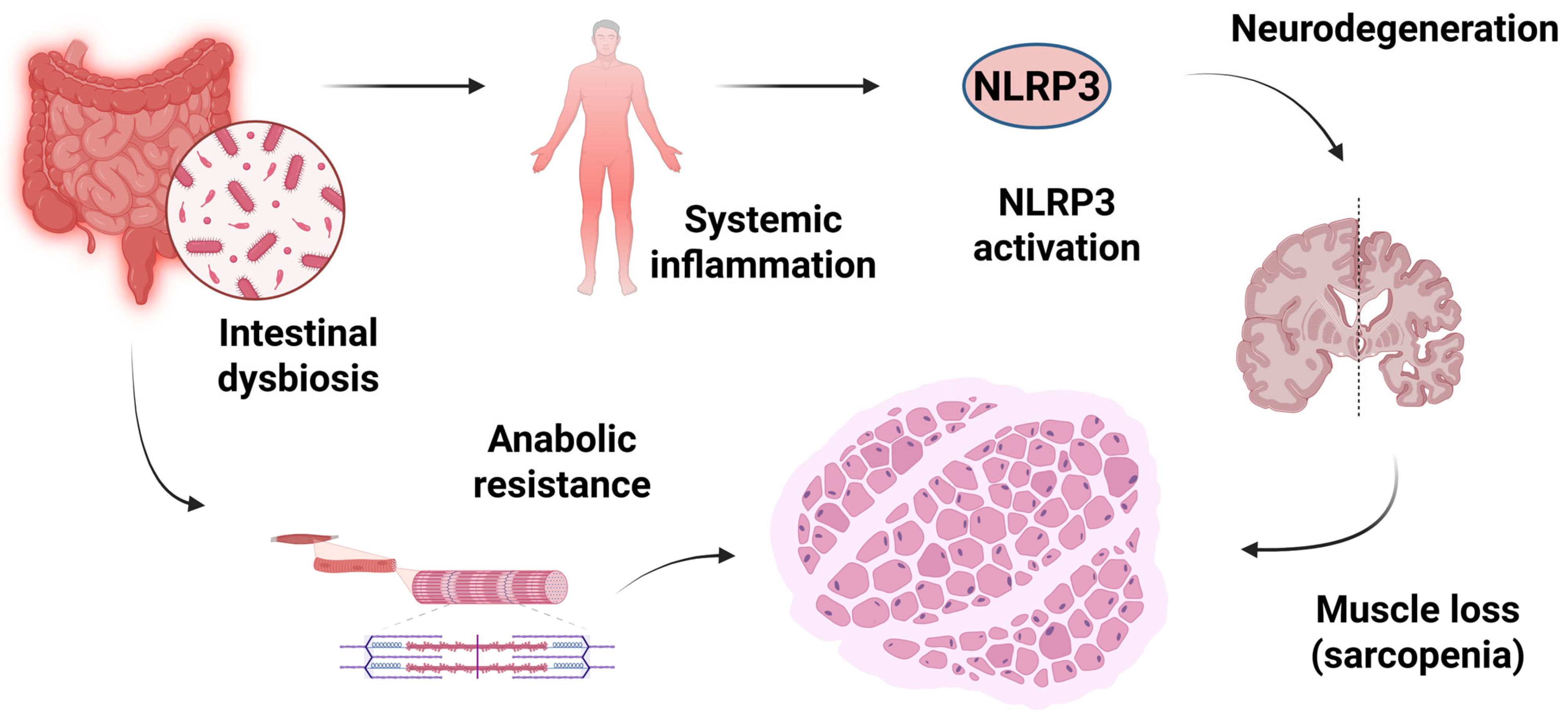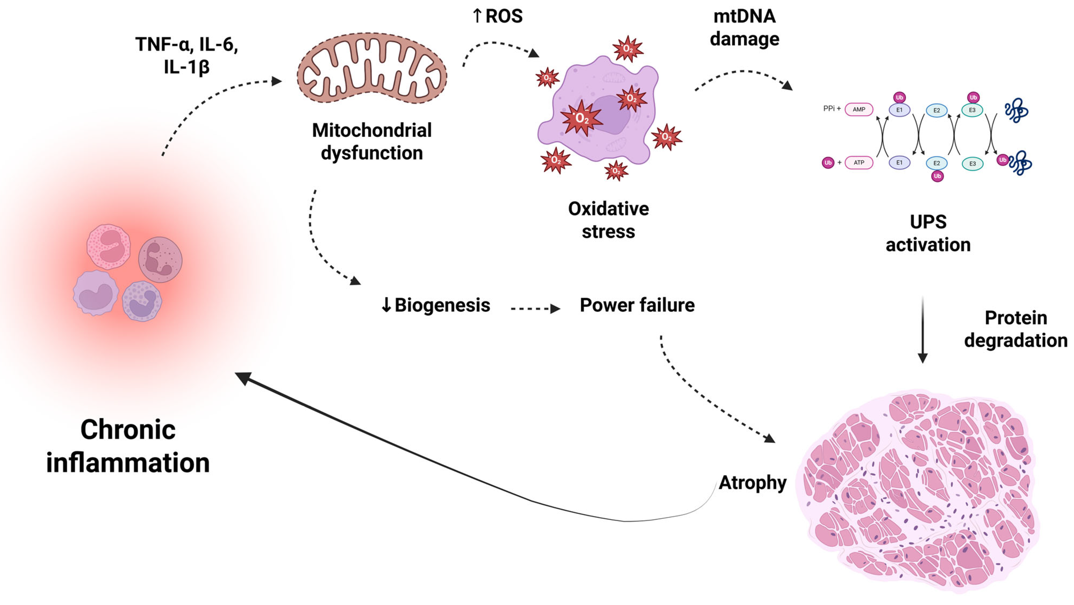 | Chronic inflammation | - ↑ TNF-α, IL-6, IL-1β; - NLRP3 inflammasome activation; - Pyroptosis. | - Proteolysis via UPS; - Anabolic resistance; - Fatty infiltration. | [89,90,91] |