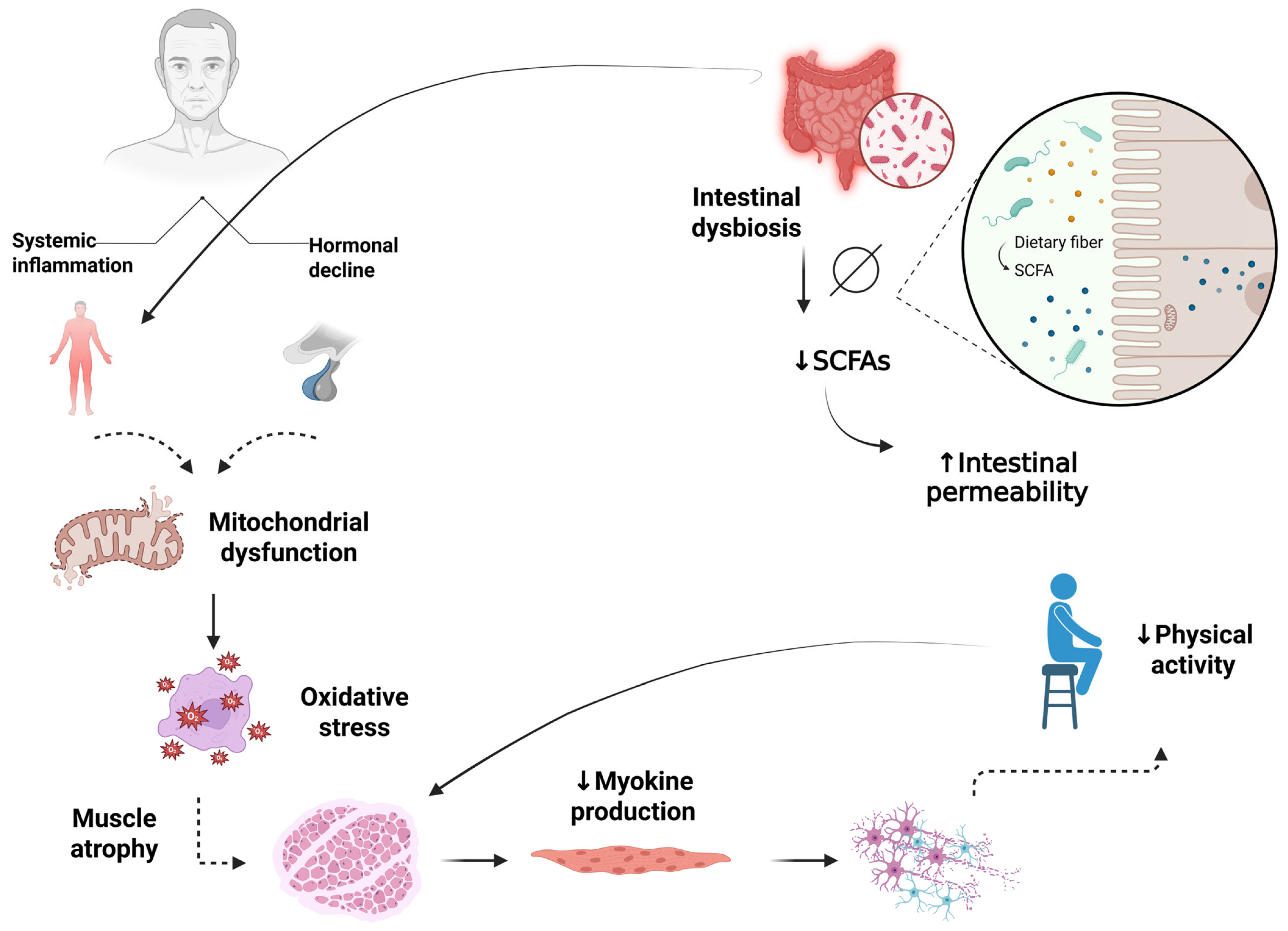 | Gut dysbiosis | - SCFAs | - With aging, a decline in SCFA-producing gut microbiomes reduces SCFAs, which contribute to sarcopenia. | [114] |