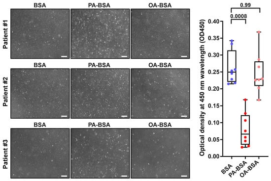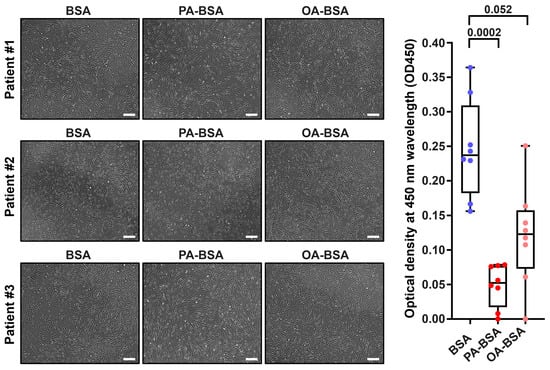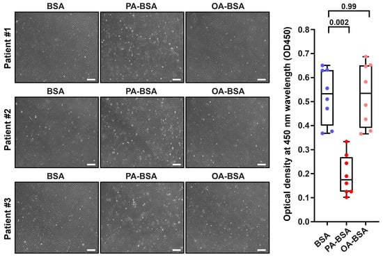Cytotoxic effects of conjugates of palmitic acid (PA) with a fatty acid-free BSA (PA-BSA, 0.8 mmol/L) or conjugates of oleic acid (OA) with a fatty acid-free BSA (OA-BSA, 0.8 mmol/L) on primary human adipose tissue-derived microvascular endothelial cells (HMVEC) after the 24 h incubation. Fatty acid-free bovine serum albumin (BSA) was used as a control group. (Left): Phase contrast microscopy; representative images. Magnification: ×200. Scale bar: 100 µm. (Right): Microplate colorimetric analysis of proliferation and viability (WST-8 assay). Each dot on the plots represents an arithmetic mean of eight replicates (i.e., 8 wells of a 96-well plate) for each patient (n = 12 patients, n = 3 per each of the indicated EC types). Box-and-whisker plot. Whiskers indicate the range, box bounds indicate the 25th–75th percentiles, and center lines indicate the median. p-Values are provided above the boxes, via the Kruskal–Wallis test with subsequent Dunn’s multiple comparisons test.