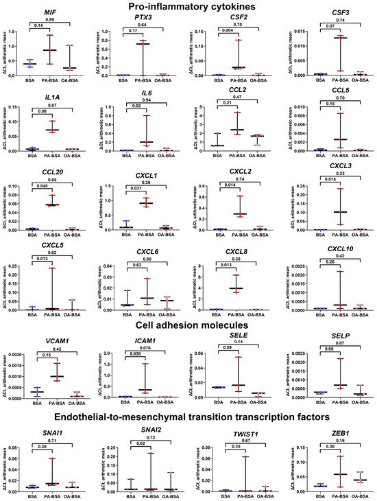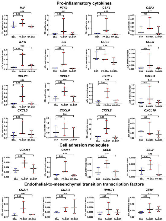 Relative levels of gene expression (arithmetic mean) in genes encoding pro-inflammatory cytokines (MIF, PTX3, CSF2, CSF3, IL1A, IL6, CCL2, CCL5, CCL20, CXCL1, CXCL2, CXCL3, CXCL5, CXCL6, CXCL8, and CXCL10), pro-inflammatory cell adhesion molecules (VCAM1, ICAM1, SELE, and SELP), and endothelial-to-mesenchymal transition transcription factors (SNAI1, SNAI2, TWIST1, and ZEB1) in primary human internal thoracic artery endothelial cells (HITAEC) incubated with control fatty acid-free bovine serum albumin (BSA), conjugates of palmitic acid (PA) with a fatty acid-free BSA (PA-BSA, 0.8 mmol/L), or conjugates of oleic acid (OA) with a fatty acid-free BSA (OA-BSA, 0.8 mmol/L) for 24 h. Box-and-whisker plot. Whiskers indicate the range; p-values are provided above boxes, via a ratio paired t-test (i.e., ratios of paired values but not absolute differences between paired values were compared).