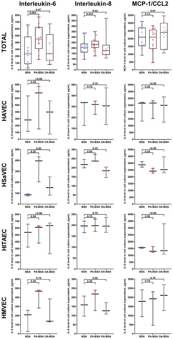 Enzyme-linked immunosorbent assay measurements of interleukin-6, interleukin-8, and MCP-1/CCL2 in pre-centrifuged (2000× g) serum-free cell culture supernatant from primary human aortic valve endothelial cells (HAVEC), human saphenous vein endothelial cells (HSaVEC), human internal thoracic artery endothelial cells (HITAEC), and human microvascular endothelial cells (HMVEC) incubated with control fatty acid-free bovine serum albumin (BSA), conjugates of palmitic acid (PA) with a fatty acid-free BSA (PA-BSA, 0.8 mmol/L), or conjugates of oleic acid (OA) with a fatty acid-free BSA (OA-BSA, 0.8 mmol/L) for 24 h. Each dot on the plots represents an arithmetic mean of two replicates (i.e., 8 wells of a 96-well plate) for each patient (n = 12 patients, n = 3 per each of the indicated EC types). Box-and-whisker plot. Whiskers indicate the range, box bounds indicate the 25th–75th percentiles, and center lines indicate the median. p-Values are provided above the boxes, via Wilcoxon matched-pairs signed-rank test.