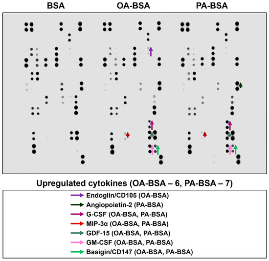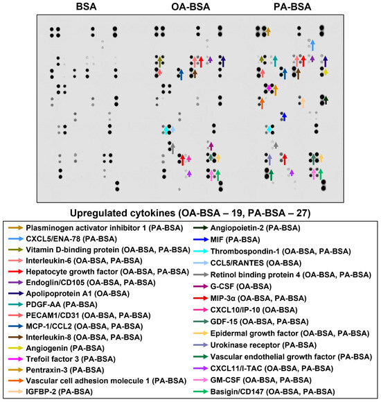 Semi-quantitative dot blot assessment of pro-inflammatory cytokines in pre-centrifuged (2000× g), tenfold-enriched serum-free cell culture supernatant withdrawn from primary human microvascular endothelial cells (HMVEC) incubated with control fatty acid-free bovine serum albumin (BSA), conjugates of oleic acid (OA) with a fatty acid-free BSA (OA-BSA, 0.8 mmol/L), or conjugates of palmitic acid (PA) with a fatty acid-free BSA (PA-BSA, 0.8 mmol/L) for 24 h. The intensity of colored black dots directly reflects the expression level of the corresponding protein. The list of cytokines overrepresented in the cell culture supernatant (with the corresponding color-coded arrows) is shown below the figure. Arrow length represents the fold change upon densitometric analysis of chemiluminescent images, performed in the ImageJ software (version 1.54k). Short, medium, and long arrows represent fold changes of 1.20–1.34, 1.35–1.49, and ≥1.50, respectively, relative to densitometric values in the BSA group. In cases where protein was not expressed in the BSA group but was detected in OA-BSA or PA-BSA groups, densitometric values ≤ 4999, from 5000 to 9999, and ≥10,000 arbitrary units were denoted with short, medium, and long arrows, respectively.