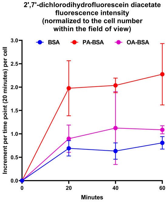 Measurement of reactive oxygen species (ROS)’s generation in human umbilical vein endothelial cells (HUVEC) incubated with control fatty acid-free bovine serum albumin (BSA), conjugates of palmitic acid (PA) with a fatty acid-free BSA (PA-BSA, 0.8 mmol/L), or conjugates of oleic acid (OA) with a fatty acid-free BSA (OA-BSA, 0.8 mmol/L) for 120 h. ROS generation in the ECs was detected by 2′,7′-dichlorodihydrofluorescein diacetate (DCF-DA) staining after PA-BSA or OA-BSA challenge. DCF fluorescence was recorded from the same positions in wells every 20 min for a total period of 1 h (i.e., three times) with fixed exposure settings, and was normalized to the cell number within the field of view. Each dot on the plots represents an arithmetic mean of three replicates (i.e., three wells of a 96-well plate), while whiskers indicate the standard deviation.