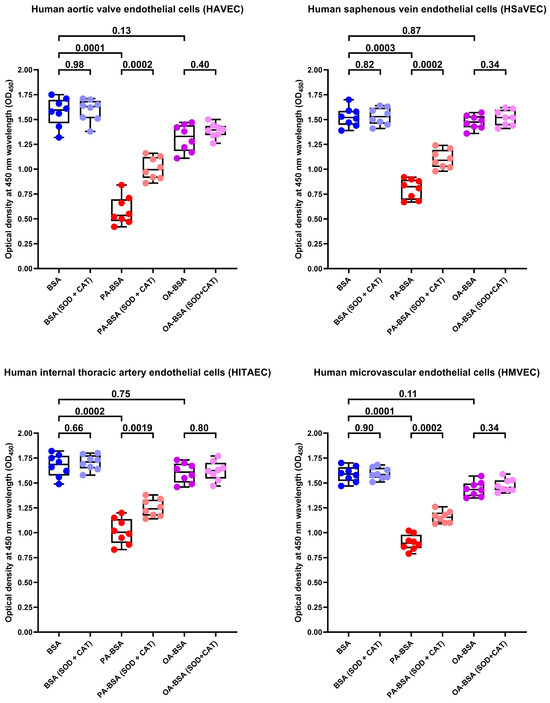 Superoxide dismutase (SOD, 250 U/mL) and catalase (CAT, 500 U/mL) rescue endothelial cells (ECs) from palmitic acid (PA)-induced death. Microplate colorimetric analysis of proliferation and viability (WST-8 assay) of primary human aortic valve endothelial cells (HAVEC), human saphenous vein endothelial cells (HSaVEC), human internal thoracic artery endothelial cells (HITAEC), and human microvascular endothelial cells (HMVEC) incubated with control fatty acid-free bovine serum albumin (BSA), conjugates of palmitic acid (PA) with a fatty acid-free BSA (PA-BSA, 0.8 mmol/L), or conjugates of oleic acid (OA) with a fatty acid-free BSA (OA-BSA, 0.8 mmol/L) for 24 h. Each dot on the plots represents an arithmetic mean of eight replicates (i.e., 8 wells of a 96-well plate). Box-and-whisker plot. Whiskers indicate the range, box bounds indicate the 25th–75th percentiles, and center lines indicate the median. p-Values are provided above boxes. The Mann–Whitney U-test was used to analyze the pairwise comparisons with and without superoxide dismutase and catalase treatment, and the Kruskal–Wallis test with subsequent Dunn’s multiple comparisons test were used for analyzing the comparisons of BSA with PA-BSA and OA-BSA.
