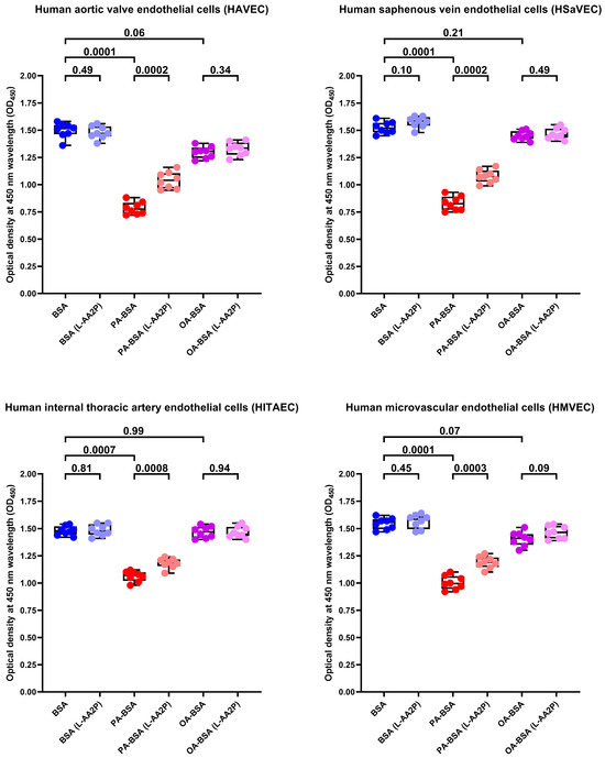 L-ascorbic acid 2-phosphate (L-AA2P, 50 µg/mL) rescues endothelial cells (ECs) from palmitic acid (PA)-induced death. Microplate colorimetric analysis of proliferation and viability (WST-8 assay) of primary human aortic valve endothelial cells (HAVEC), human saphenous vein endothelial cells (HSaVEC), human internal thoracic artery endothelial cells (HITAEC), and human microvascular endothelial cells (HMVEC) incubated with control fatty acid-free bovine serum albumin (BSA), conjugates of palmitic acid (PA) with a fatty acid-free BSA (PA-BSA, 0.8 mmol/L), or conjugates of oleic acid (OA) with a fatty acid-free BSA (OA-BSA, 0.8 mmol/L) for 24 h. Each dot on the plots represents an arithmetic mean of eight replicates (i.e., 8 wells of a 96-well plate). Box-and-whisker plot. Whiskers indicate the range, box bounds indicate the 25th–75th percentiles, and center lines indicate the median. p-Values are provided above the boxes. The Mann–Whitney U-test was used to analyze the pairwise comparisons with and without L-ascorbic acid 2-phosphate treatment, and the Kruskal–Wallis test with subsequent Dunn’s multiple comparisons test were used for analyzing the comparisons of BSA with PA-BSA and OA-BSA.