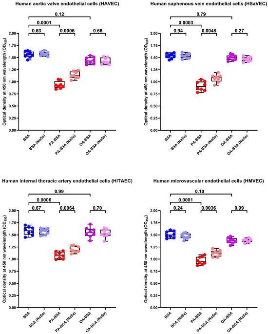 Sodium selenite (NaSe, 7 µg/mL) rescues endothelial cells (ECs) from palmitic acid (PA)-induced death. Microplate colorimetric analysis of proliferation and viability (WST-8 assay) of primary human aortic valve endothelial cells (HAVEC), human saphenous vein endothelial cells (HSaVEC), human internal thoracic artery endothelial cells (HITAEC), and human microvascular endothelial cells (HMVEC) incubated with control fatty acid-free bovine serum albumin (BSA), conjugates of palmitic acid (PA) with a fatty acid-free BSA (PA-BSA, 0.8 mmol/L), or conjugates of oleic acid (OA) with a fatty acid-free BSA (OA-BSA, 0.8 mmol/L) for 24 h. Each dot on the plots represents an arithmetic mean of eight replicates (i.e., 8 wells of a 96-well plate). Box-and-whisker plot. Whiskers indicate the range, box bounds indicate the 25th–75th percentiles, and center lines indicate the median. p-Values are provided above boxes. The Mann–Whitney U-test was used to analyze the pairwise comparisons with and without sodium selenite treatment, and the Kruskal–Wallis test with subsequent Dunn’s multiple comparisons test were used for analyzing the comparisons of BSA with PA-BSA and OA-BSA.