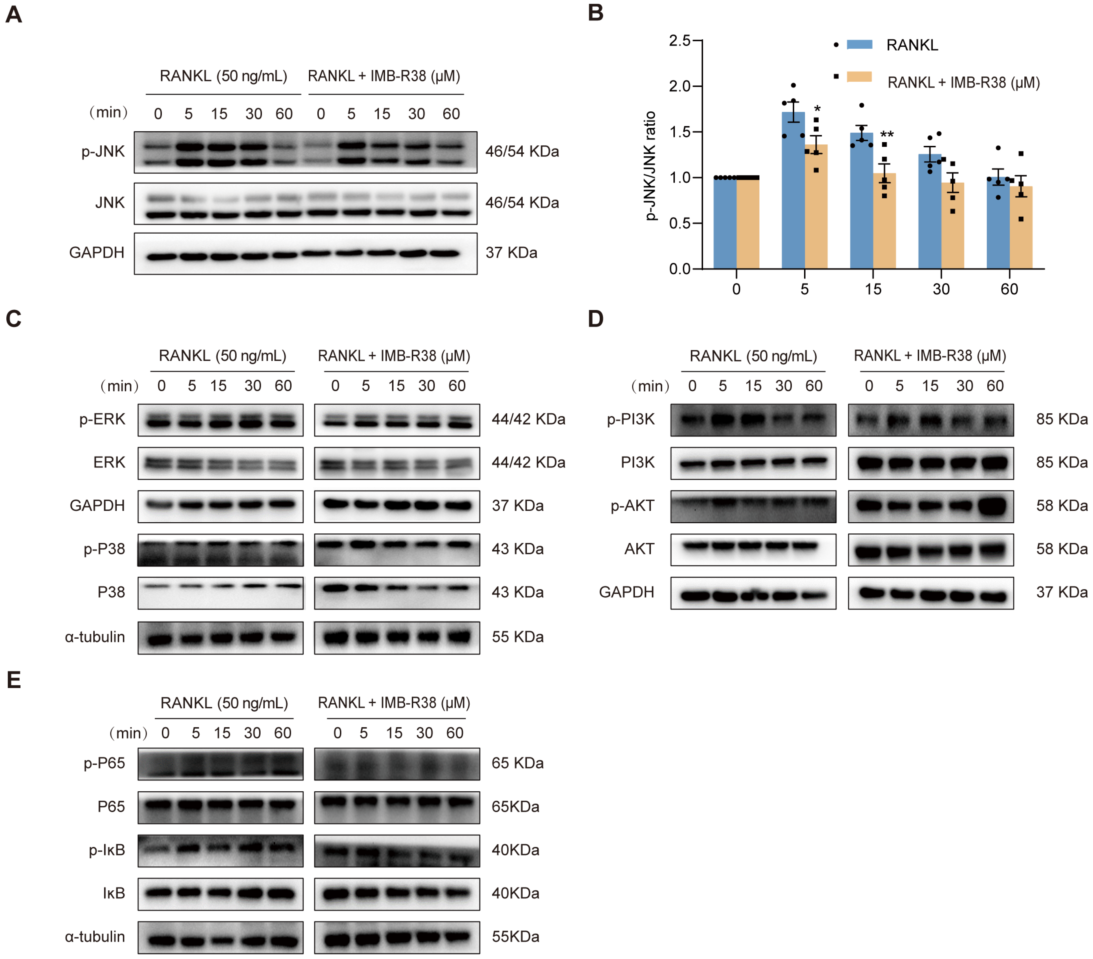 2.7. IMB-R38 Inhibits RANKL-Stimulated Activation of MAPK Signaling Pathways