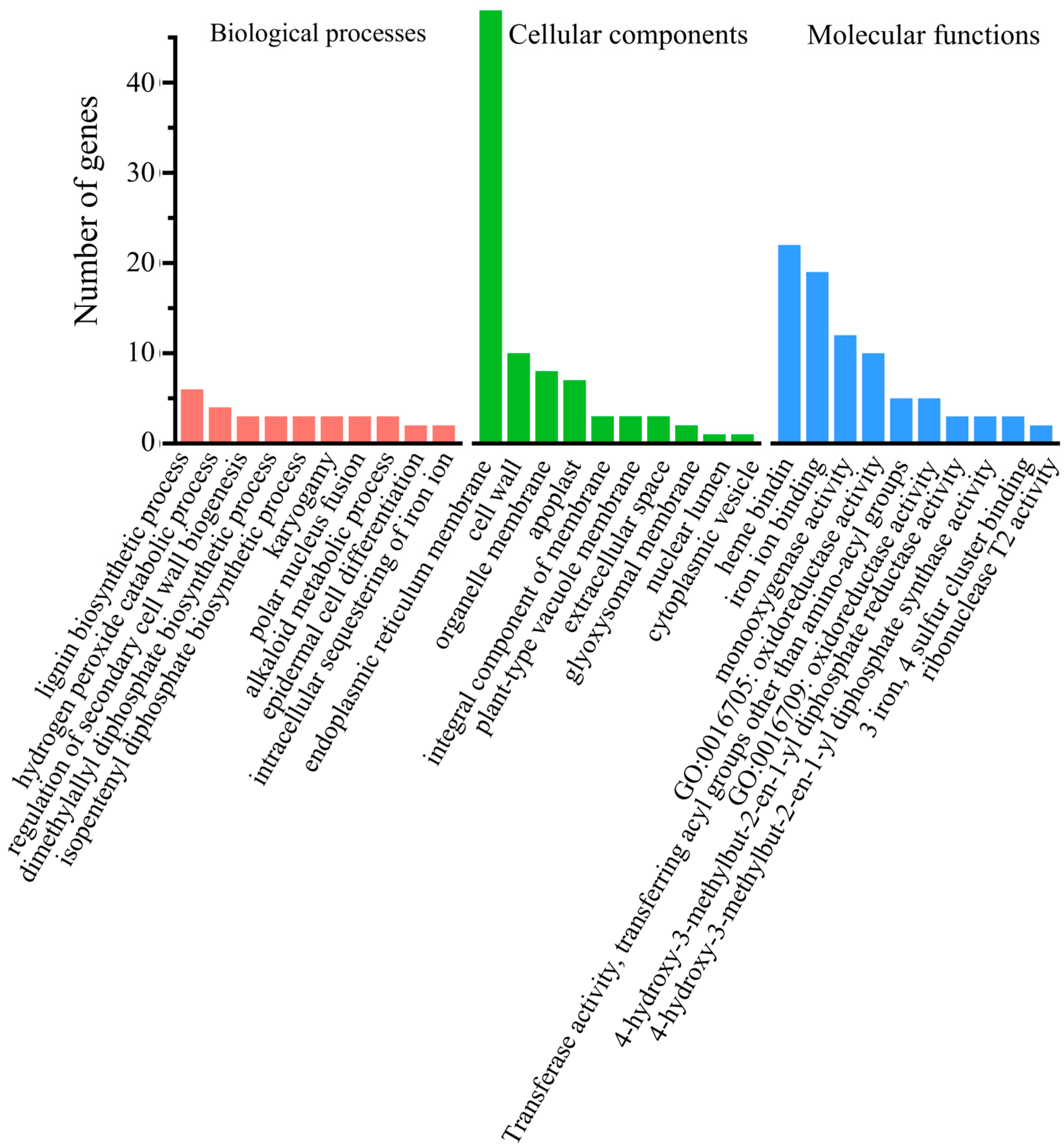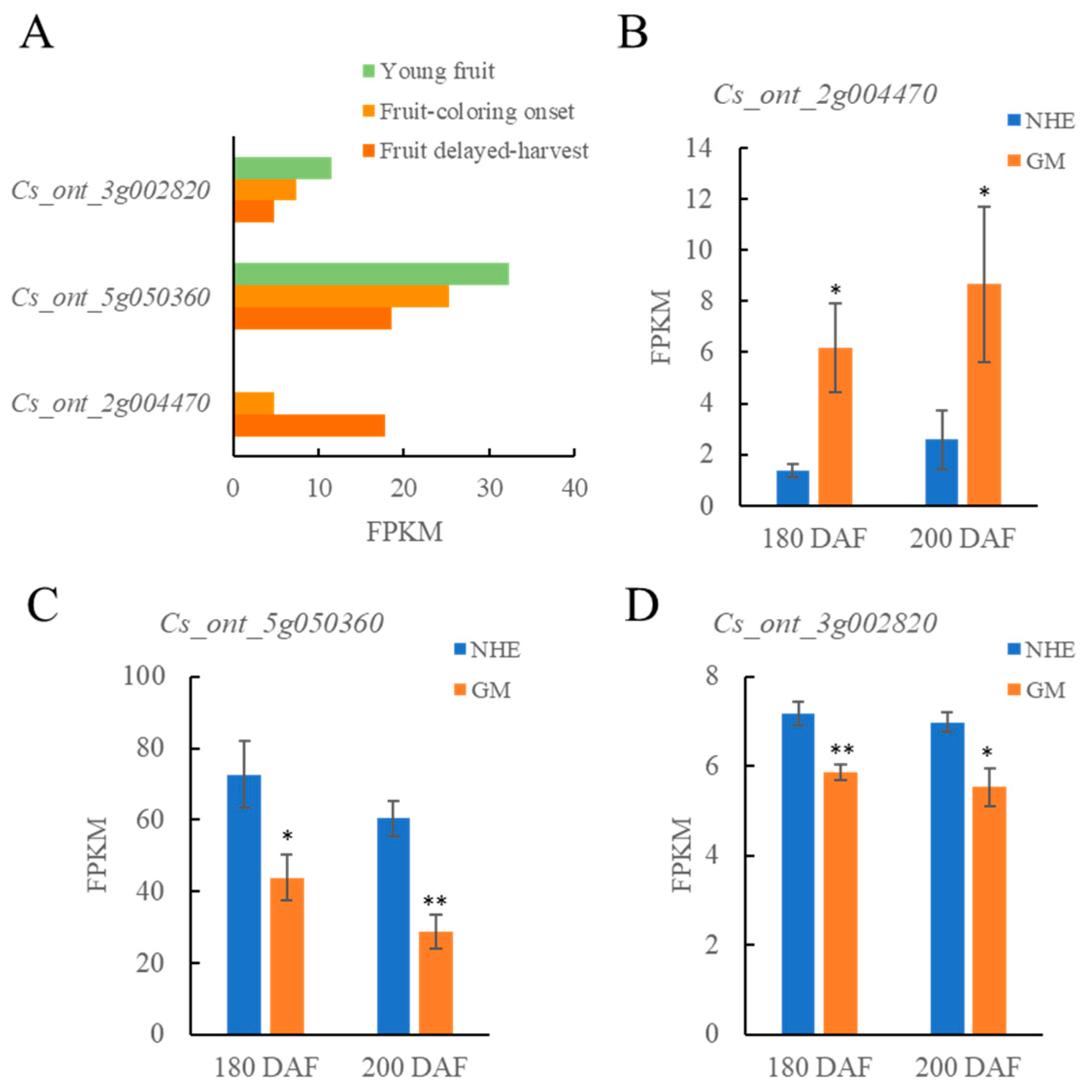 2.2. Analysis of Differentially Expressed Genes (DEGs) in the Pulps of Ganmi and Newhall Navel Oranges