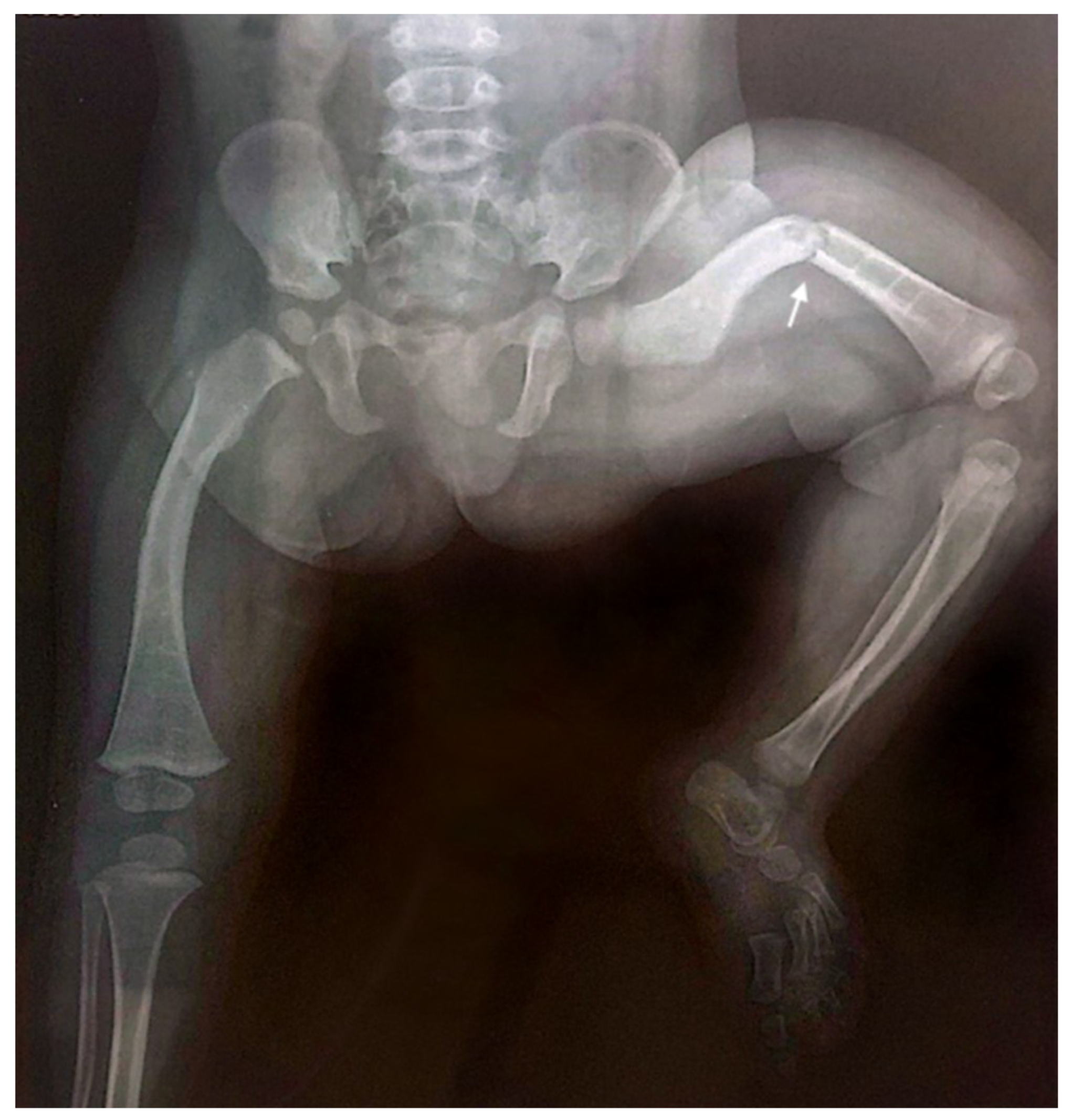 Throughout childhood and adolescence, the patient sustained eight fractures involving various skeletal sites, with four fractures affecting the left femur. The X-ray of the lower limbs taken at the age of one year and seven months demonstrated evidence of poor bone consolidation (