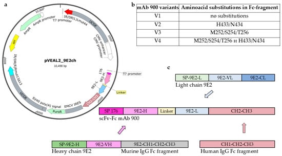 Figure 1. Structure of expression plasmids. (a) pVEAL2_9E2ch map. The plasmid contains the following elements: ori—the origin of replication, the IR/DR—direct and inverted repeat sequences containing SB100 transposase binding sites, the UCOE sequences preventing chromosomal silencing, the CMV enhancer, the CMV promoter, the signal peptide 176 (SP 176)—a sequence encoding a hybrid signal peptide of luciferase and fibroin that ensures protein export from the cell, the 9E2-H, 9E2-L sequences encoding variable fragments of the heavy and light chains of the monoclonal antibody (mAb) 9E2 connected by a peptide linker, the CH2-CH3—fragment of the constant chain of the human IgG1 antibody, the EMCV IRES—internal ribosome entry site, the PuroR—puromycin antibiotic resistance gene, the SV40 poly(A) signal; ampicillin resistance gene AmpR; (b) variants of amino acid substitutions in the Fc fragment of mAb 900. Variant V1 does not contain amino acid substitutions in the human IgG Fc fragment. Variant V2 contains amino acid substitutions H433/N434 in the human IgG Fc fragment. Variant V3 contains amino acid substitutions M252/S254/T256 in the human IgG Fc fragment. Variant V4 contains amino acid substitutions H433/N434 and M252/S254/T256 in the human IgG Fc fragment; (c) Scheme of expression plasmid construction.