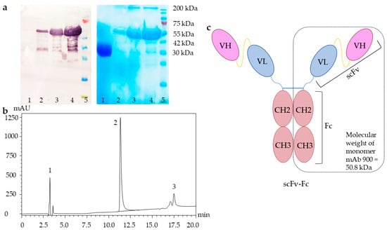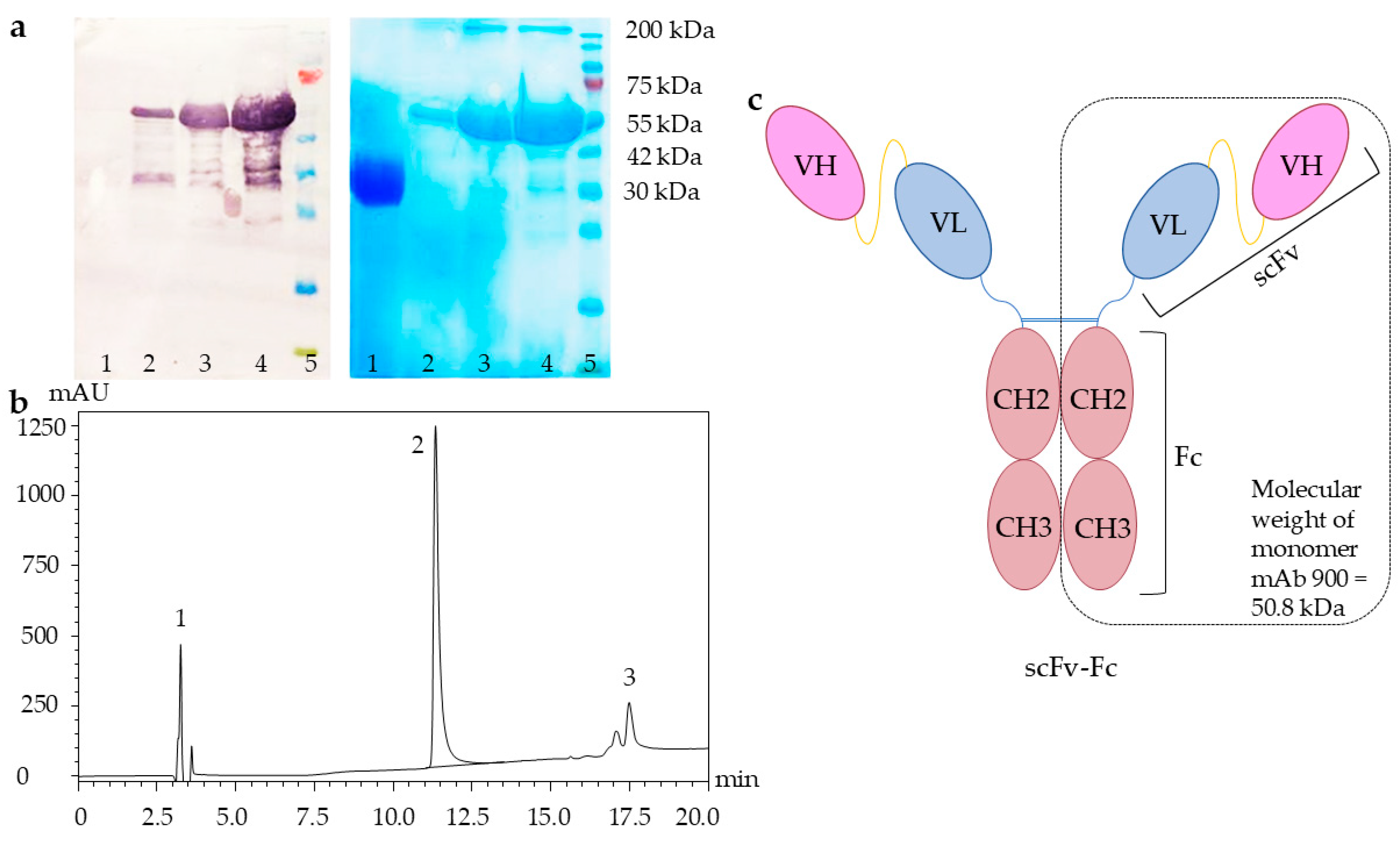 Figure 2. Analysis of purified recombinant mAb 900. (a) Western blot (left panel) and SDS-PAGE (right panel) analysis. Lane 1: negative control (SARS-CoV-2 RBD); lanes 2–4: mAb 900 (1, 5, and 10 µL, respectively); lane 5: prestained protein molecular weight marker (10–200 kDa). (b) Reversed-phase high-performance liquid chromatography (RP-HPLC) profile. Peak 1: low-molecular-weight impurities; peak 2: monomeric mAb 900; peak 3: high-molecular-weight aggregates. (c) Schematic representation of the scFv-Fc format of mAb 900.