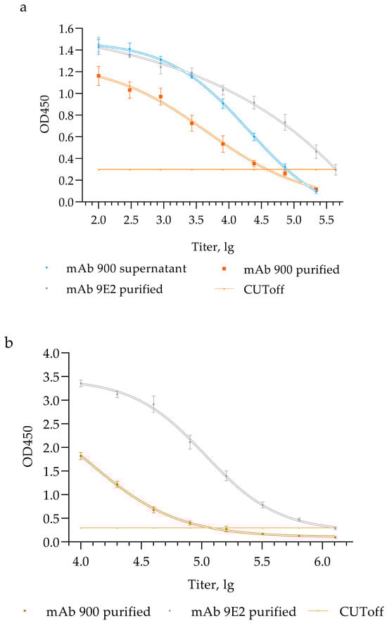Murine mAb 9E2, previously shown to possess neutralizing activity [21,22,23], was used as a control. The IC50 of purified mAb 900 was 74 ng/mL, 2.5-fold lower than that of unpurified mAb 900 (185 ng/mL), indicating a substantial enhancement of the antibody’s specific functional activity following removal of impurities. This improvement likely reflects the elimination of components that hinder specific antigen binding.